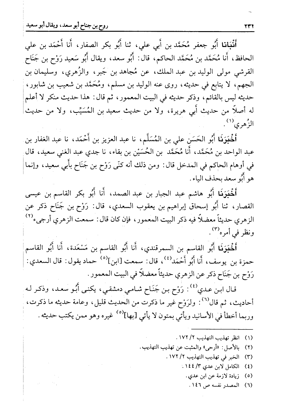 أنبأنا أبو جعفر محمد بن أبي علي ثنا أبو بكر الصفار أنا أحمد بن علي الحافظ أنا محمد بن محمد الحاكم قال أبو سعد ويقال أبو سعيد روح بن جناح القرشي مولى الوليد بن عبد الملك عن مجاهد بن جبر والزهري وسليمان بن الجهم لا يتابع في حديثه روى عنه الوليد بن مسلم ومحمد بن شعيب بن شابور حديثه ليس بالقائم وذكر حديثه في البيت المعمور ثم قال هذا حديث منكر لا أعلم له أصلا من حديث أبي هريرة ولا من حديث سعيد بن المسيب ولا من حديث الزهري (1) أخبرنا أبو الحسن علي بن المسلم نا عبد العزيز بن أحمد نا عبد الغفار بن عبد الواحد بن محمد أنا محمد بن الحسين بن بقاء نا جدي عبد الغني سعيد قال في أوهام الحاكم في المدخل قال ومن ذلك أنه كنى روح بن جناح بأبي سعيد وإنما هو أبو سعد بحذف الياء أخبرنا أبو هاشم عبد الجبار بن عبد الصمد أنا أبو بكر القاسم بن عيسى القصار ثنا أبو إسحاق إبراهيم بن يعقوب السعدي قال روح بن جناح ذكر عن الزهري حديثا معضلا فيه ذكر البيت المعمور فإن كان قال سمعت الزهري أرجئ (2) ونظر في أمره (3) أخبرنا أبو القاسم بن السمرقندي أنا أبو القاسم بن مسعدة أنا أبو القاسم حمزة بن يوسف أنا أبو أحمد (4) قال سمعت ابن (5) حماد يقول قال السعدي روح بن جناح ذكر عن الزهري حديثا معضلا في البيت المعمور قال ابن عدي (4) روح بن جناح شامي دمشقي يكنى أبو سعد وذكر له أحاديث ثم قال (6) ولروح غير ما ذكرت من الحديث قليل وعامة حديثه ما ذكرت وربما أخطأ في الأسانيد ويأتي بمتون لا يأتي بها (5) غيره وهو ممن يكتب حديثه