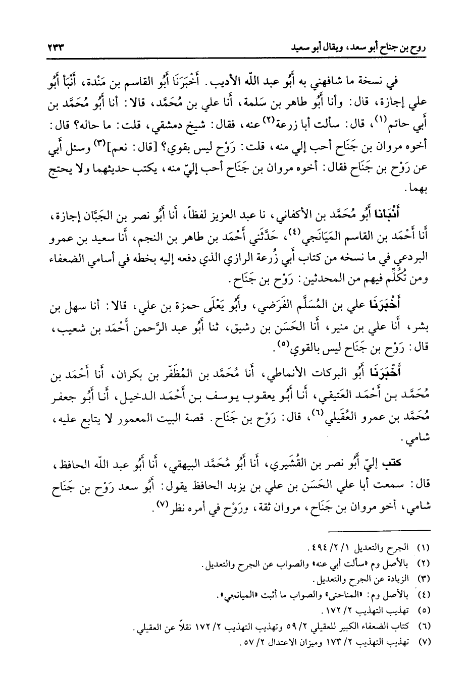 في نسخة ما شافهني به أبو عبد الله الأديب أخبرنا أبو القاسم بن مندة أنبأ أبو علي إجازة قال أنا أبو طاهر بن سلمة أنا علي بن محمد قالا أنا أبو محمد بن أبي حاتم (1) قال سألت أبا زرعة (2) عنه فقال شيخ دمشقي قلت ما حاله قال أخوه مروان بن جناح أحب إلي منه قلت روح ليس بقوي قال نعم (3) وسئل أبي عن روح بن جناح فقال أخوه مروان بن جناح أحب إلي منه يكتب حديثهما ولا يحتج بهما أنبأنا أبو محمد بن الأكفاني نا عبد العزيز لفظا أنا أبو نصر بن الجبان إجازة أنا أحمد بن القاسم الميانجي (4) حدثني أحمد بن طاهر بن النجم أنا سعيد بن عمرو البردعي في ما نسخه من كتاب أبي زرعة الرازي الذي دفعه إليه بخطه في أسامي الضعفاء ومن تكلم فيهم من المحدثين روح بن جناح أخبرنا علي بن المسلم الفرضي وأبو يعلى حمزة بن علي قالا أنا سهل بن بشر أنا علي بن منير أنا الحسن بن رشيق ثنا أبو عبد الرحمن أحمد بن شعيب قال روح بن جناح ليس بالقوي (5) أخبرنا أبو البركات الأنماطي أنا محمد بن المظفر بن بكران أنا أحمد بن محمد بن أحمد العتيقي أنا أبو يعقوب يوسف بنأحمد الدخيل أنا أبو جعفر محمد بن عمرو العقيلي (6) قال روح بن جناح قصة البيت المعمور لا يتابع عليه شامي كتب إلي أبو نصر بن القشيري أنا أبو محمد البيهقي أنا أبو عبد الله الحافظ قال سمعت أبا علي الحسن بن علي بن يزيد الحافظ يقول أبو سعد روح بن جناح شامي أخو مروان بن جناح مروان ثقة وروح في أمره نظر (7)