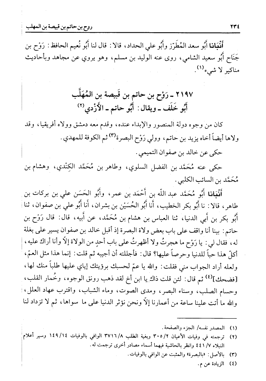 2197 - روح بن حاتم بن قبيصة بن المهلب أبو خلف ويقال أبو حاتم الأزدي (2) كان من وجوه دولة المنصور والإبداء عنده وقدم معه دمشق وولاه أفريقيا وقد ولاها أيضا أخاه يزيد بن حاتم وولي روح البصرة (3) ثم الكوفة للمهدي حكى عن خالد بن صفوان التميمي حكى عنه محمد بن الفضل السلوي وطاهر بن محمد الكندي وهشام بن محمد بن السائب الكلبي أنبأنا أبو محمد عبد الله بن أحمد بن عمر وأبو الحسن علي بن بركات بن طاهر قالا نا أبو بكر الخطيب أنا أبو الحسين بن بشران أنا أبو علي بن صفوان ثنا أبو بكر بنأبي الدنيا ثنا العباس بن هشام بن محمد عن أبيه قال قال روح بن حاتم بينا أنا واقف على باب بعض ولاة البصرة إذ أقبل خالد بن صفوان يسير على بغلة له فقال لي يا روح ما هجرت ولا أظهرت على باب أحد من الولاة إلا وأنا أراك عليه أكل هذا حبا للدنيا وحرصا عليها قال فأجللته أن أجيبه ثم قلت إنما هذا مثل العم ولعله أراد الجواب مني فقلت والله يا عم لحسبك برؤيتك إياي عليها طلبا منك لها فضحك (4) ثم قال لئن قلت ذاك يا ابن أخ لقد ذهب رونق الوجوه وخمار القلب وحسام الصلب وسناء البصر ومدى الصوت وماء الشباب واقترب عهاد العلل والله ما أتت علينا ساعة من أعمارنا إلا ونحن نؤثر الدنيا على ما سواها ثم لا تزداد لنا