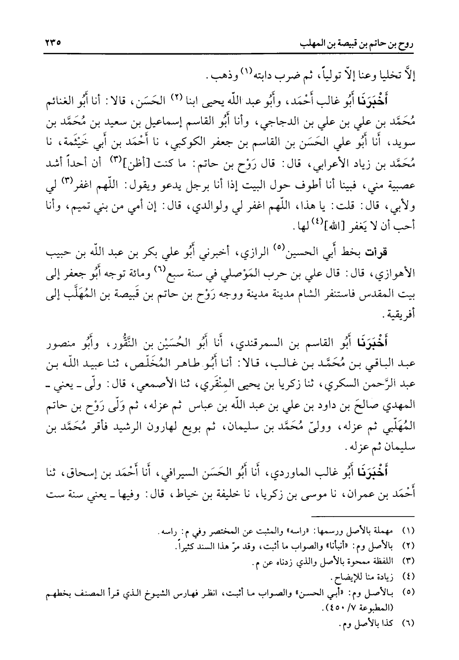 إلا تخليا وعنا إلا توليا ثم ضرب دابته (1) وذهب أخبرنا أبو غالب أحمد وأبو عبد الله يحيى ابنا (2) الحسن قالا أنا أبو الغنائم محمد بن علي بن بن علي بن الدجاجي وأنا أبو القاسم إسماعيل بن سعيد بن محمد بن سويد أنا أبو علي الحسن بن القاسم بن جعفر الكوكبي نا أحمد بن أبي خيثمة نا محمد بن زياد الأعرابي قال قال روح بن حاتم ما كنت أظن (3) أن أحدا أشد عصبية مني فبينا أنا أطوف حول البيت إذا أنا برجل يدعو ويقول اللهم اغفر (3) لي ولأبي قال قلت يا هذا اللهم اغفر لي ولوالدي قال إن أمي من بني تميم وأنا أحب أن لا يغفر الله (4) لها قرأت بخط أبي الحسين (5) الرازي أخبرني أبو علي بكر بن عبد الله بن حبيب الأهوازي قال قال علي بن حرب الموصلي في سنة سبع (6) ومائة توجه أبو جعفر إلى بيت المقدس فاستنفر الشام مدينة مدينة ووجه روح بن حاتم بن قبيصة بن المهلب إلى أفريقية أخبرنا أبو القاسم بن السمرقندي أنا أبو الحسين بن النقور وأبو منصور عبد الباقي بن محمد بن غالب قالا أنا أبو طاهر المخلص ثنا عبيد الله بن عبد الرحمن السكري ثنا زكريا بن يحيى المنقري ثنا الأصمعي قال ولى يعني المهدي صالح بن داود بن علي بن عبد الله بن عباس ثم عزله ثم ولى روح بن حاتم المهلبي ثم عزله وولى محمد بن سليمان ثم بويع لهارون الرشيد فأقر محمد بن سليمان ثم عزله أخبرنا أبو غالب الماوردي أنا أبو الحسن السيرافي أنا أحمد بن إسحاق ثنا أحمد بن عمران نا موسى بن زكريا نا خليفة بن خياط قال وفيها يعني سنة ست