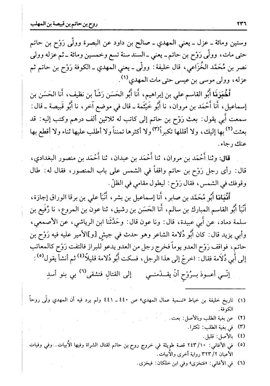 وستين ومائة عزل يعني المهدي صالح بن داود عن البصرة وولى روح بن حاتم حتى مات وولى روح بن حاتم يعني السند سنة تسع وخمسين ومائة ثم عزله وولى نصر بن محمد الخزاعي قال خليفة وولى يعني المهدي الكوفة روح بن حاتم ثم عزله وولى موسى بن عيسى حتى مات المهدي (1) أخبرنا أبو القاسم علي بن إبراهيم أنا أبو الحسن رشأ بن نظيف أنا الحسن بن إسماعيل أنا أحمد بن مروان نا أبو خيثمة قال في موضع آخر نا أبو قبيصة قال سمعت أبي يقول بعث روح بن حاتم إلى كاتب له ثلاثين ألف درهم وكتب إليه قد بعثت (2) بها إليك ولا أقللها تكبرا (3) ولا أكثرها تمننا ولا أطلب عليها ثناء ولا أقطع بها عنك رجاء قال وثنا أحمد بن مروان ثنا أحمد بن عبدان ثنا أحمد بن منصور البغدادي قال رأى رجل روح بن حاتم واقفا في الشمس على باب المنصور فقال له طال وقوفك في الشمس فقال روح ليطول مقامي في الظل أنبأنا أبو محمد بن صابر أنا إسماعيل بن بشر أنبأ علي بن برقا الوراق إجازة أنبأ أبو القاسم المبارك بن سالم أنا الحسن بن رشيق ثنا عون بن المروع نا رفيع بن سلمة دماد عن أبي عبيدة قال ونا عون قال وحدثنا ابن الرياشي عن الأصمعي أبي يزيد قال كان أبو دلامة الشاعر وهو حدث في جيش والأمير عليه فيه روح بن حاتم فواقف روح العدو يوما فخرج رجل من العدو يدعو للبراز فالتفت روح كالمعاتب إلى أبي دلامة فقال اخرج إلى هذا الرجل فسكت أبو دلامة قليلا (4) ثم أنشأ يقول (5) * إني أعوذ بروح أن يقدمني * إلى القتال فتشقى (6) بي بنو أسد
