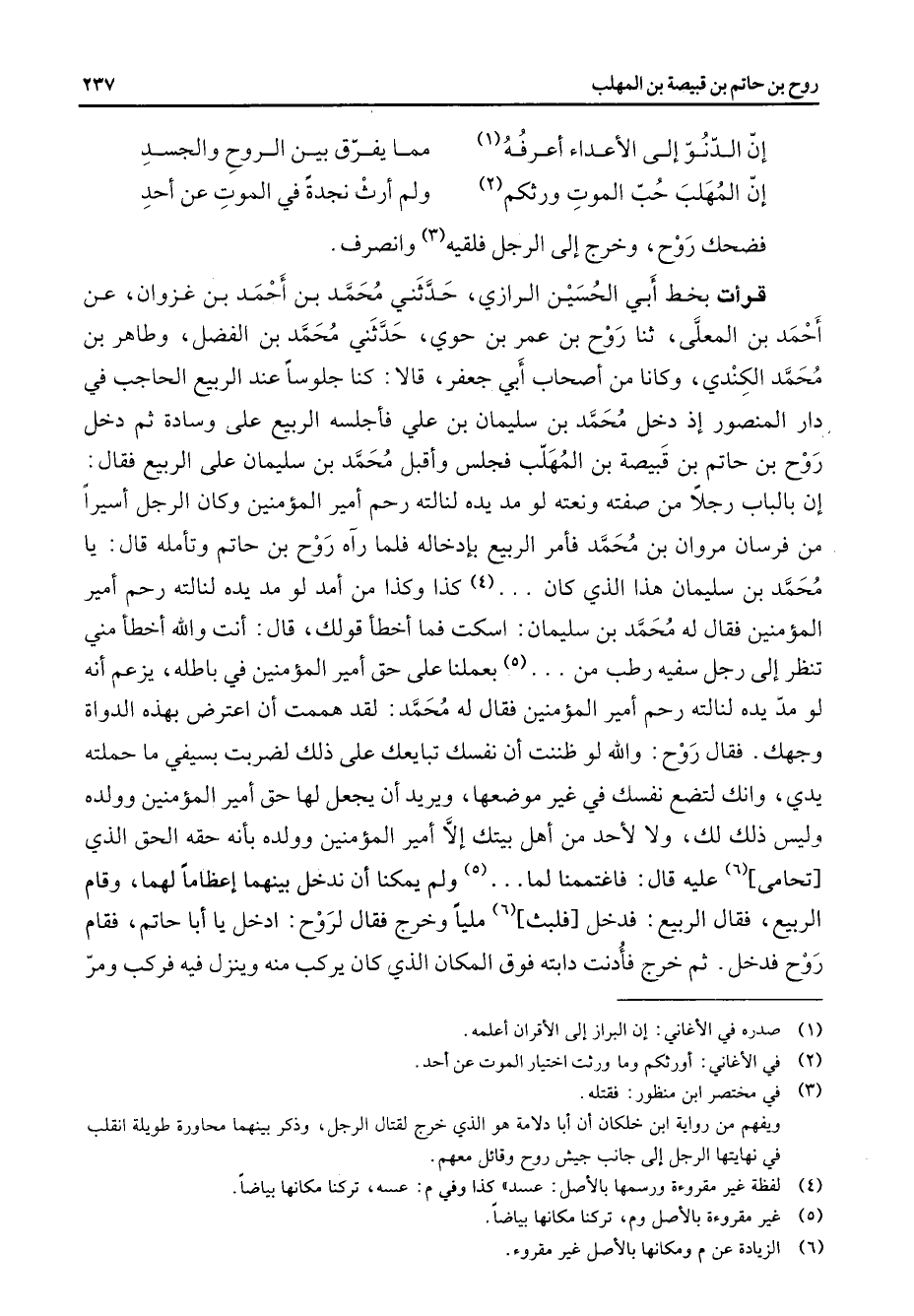 إن الدنو إلى الأعداء أعرفه (1) * مما يفرق بين الروح والجسد إن المهلب حب الموت ورثكم (2) * ولم أرث نجدة في الموت عن أحد فضحك روح وخرج إلى الرجل فلقيه (3) وانصرف قرأت بخط أبي الحسين الرازي حدثني محمد بن أحمد بن غزوان عن أحمد بن المعلى ثنا روح بن عمر بن حوي حدثني محمد بن الفضل وطاهر بن محمد الكندي وكانا من أصحاب أبي جعفر قالا كنا جلوسا عند الربيع الحاجب في دار المنصور إذ دخل محمد بن سليمان بن علي فأجلسه الربيع على وسادة ثم دخل روح بن حاتم بن قبيصة بن المهلب فجلس وأقبل محمد بن سليمان على الربيع فقال إن بالباب رجلا من صفته ونعته لو مد يده لنالته رحم أمير المؤمنين وكان الرجل أسيرا من فرسان مروان بن محمد فأمر الربيع بإدخاله فلما رآه روح بن حاتم وتأمله قال يا محمد بن سليمان هذا الذي كان (4) كذا وكذا من أمد لو مد يده لنالته رحم أمير المؤمنين فقال له محمد بن سليمان اسكت فما أخطأ قولك قال أنت والله أخطأ مني تنظر إلى رجل سفيه رطب من (5) بعملنا على حق أمير المؤمنين في باطله يزعم أنه لو مد يده لنالته رحم أمير المؤمنين فقال له محمد لقد هممت أن أعترض بهذه الدواة وجهك فقال روح لو والله ظننت أن نفسك تبايعك على ذلك لضربت بسيفي ما حملته يدي وانك لتضع نفسك في غير موضعها ويريد أن يجعل لها حق أمير المؤمنين وولده وليس ذلك لك ولا لأحد من أهل بيتك إلا أمير المؤمنين وولده بأنه حقه الحق الذي تحامى (6) عليه فاغتممنا لما (5) ولم يمكنا أن ندخل بينهما إعظاما لهما وقام الربيع فقال الربيع فدخل فلبث مليا وخرج فقال لروح ادخل يا أبا حاتم فقام روح فدخل ثم خرج فأدنت دابته فوق المكان الذي كان يركب منه وينزل فيه فركب ومر