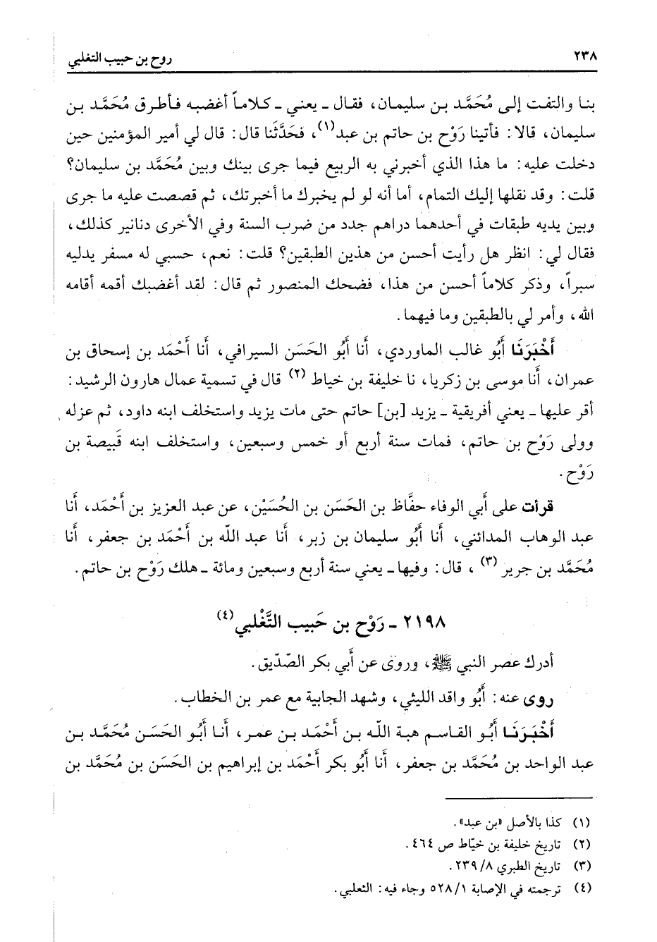 2198 - روح بن حبيب التغلبي (4) أدرك عصر النبي (صلى الله عليه وسلم) وروى عن أبي بكر الصديق روى عنه أبو واقد الليثي وشهد الجابية مع عمر بن الخطاب أخبرنا أبو القاسم هبة الله بنأحمد بن عمر أنا أبو الحسن محمد بن عبد الواحد بن محمد بن جعفر أنا أبو بكر أحمد بن إبراهيم بن الحسن بن محمد بن
