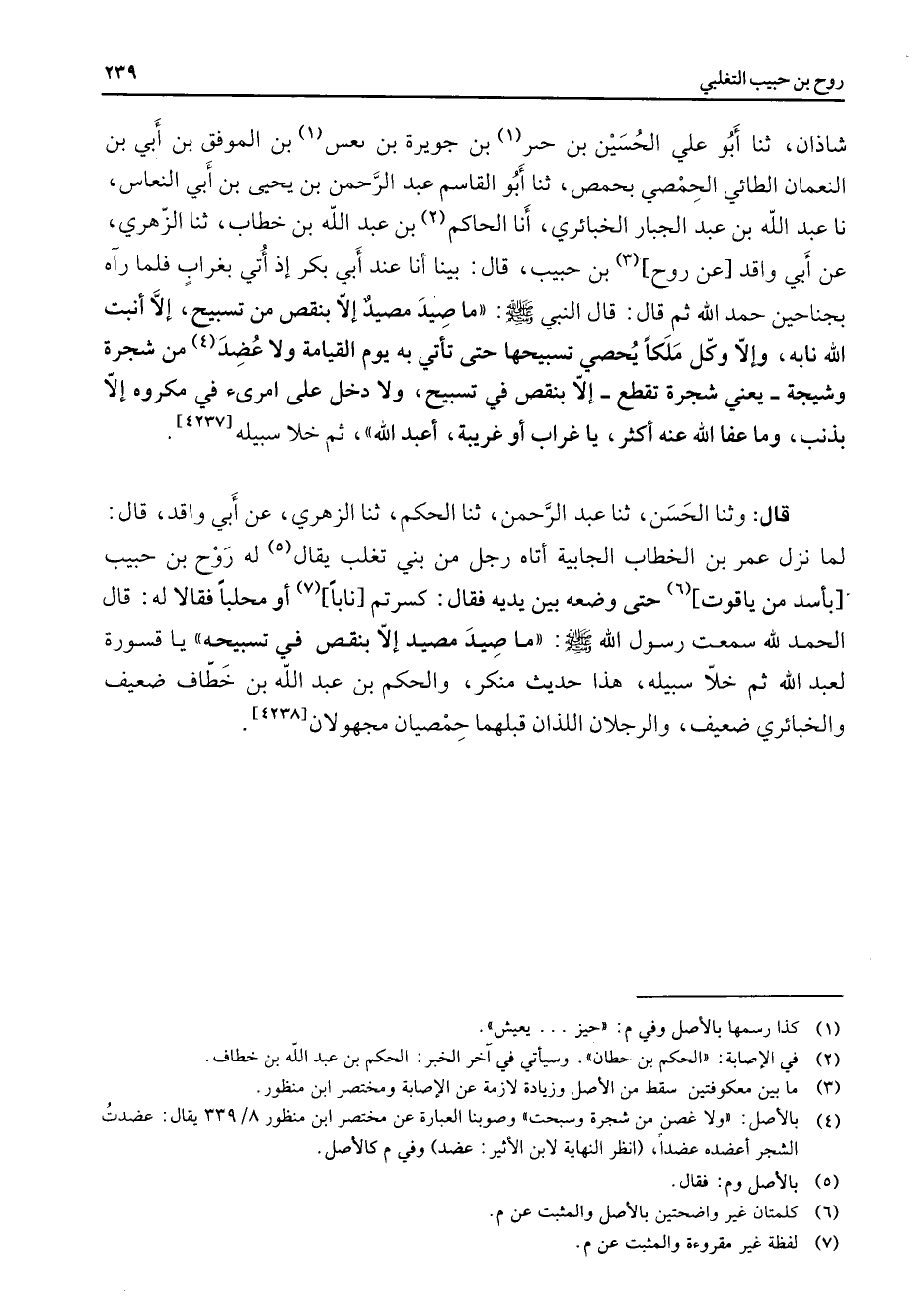 شاذان ثنا أبو علي الحسين بن حيز (1) بن جويرة بن يعيش (1) بن الموفق بن أبي بن النعمان الطائي الحمصي بحمص ثنا أبو القاسم عبد الرحمن بن يحيى بن أبي النعاس نا عبد الله بن عبد الجبار الخبائري أنا الحاكم (2) بن عبد الله بن خطاب ثنا الزهري عن أبي واقد عن روح (3) بن حبيب قال بينا أنا عند أبي بكر إذ أتي بغراب فلما رآه بجناحين حمد الله ثم قال قال النبي (صلى الله عليه وسلم) ما صيد مصيد إلا بنقص من تسبيح إلا أنبت الله نابه وإلا وكل ملكا يحصي تسبيحها حتى تأتي به يوم القيامة ولا عضد (4) من شجرة وشيجة يعني شجرة تقطع إلا بنقص في تسبيح ولا دخل على امرئ في مكروه إلا بذنب وما عفا الله عنه أكثر يا غراب أو غريبة أعبد الله ثم خلا سبيله قال وثنا الحسن ثنا عبد الرحمن ثنا الحكم ثنا الزهري عنأبي واقد قال لما نزل عمر بن الخطاب الجابية أتاه رجل من بني تغلب يقال (5) له روح بن حبيب بأسد من ياقوت (6) حتى وضعه بين يديه فقال كسرتم نابا (7) أو محلبا فقالا له قال الحمد لله سمعت رسول الله (صلى الله عليه وسلم) ما صيد مصيد إلا بنقص في تسبيحه يا قسورة لعبد الله ثم خلا سبيله هذا حديث منكر والحكم بن عبد الله بن خطاف ضعيف والخبائري ضعيف والرجلان اللذان قبلهما حمصيان مجهولان