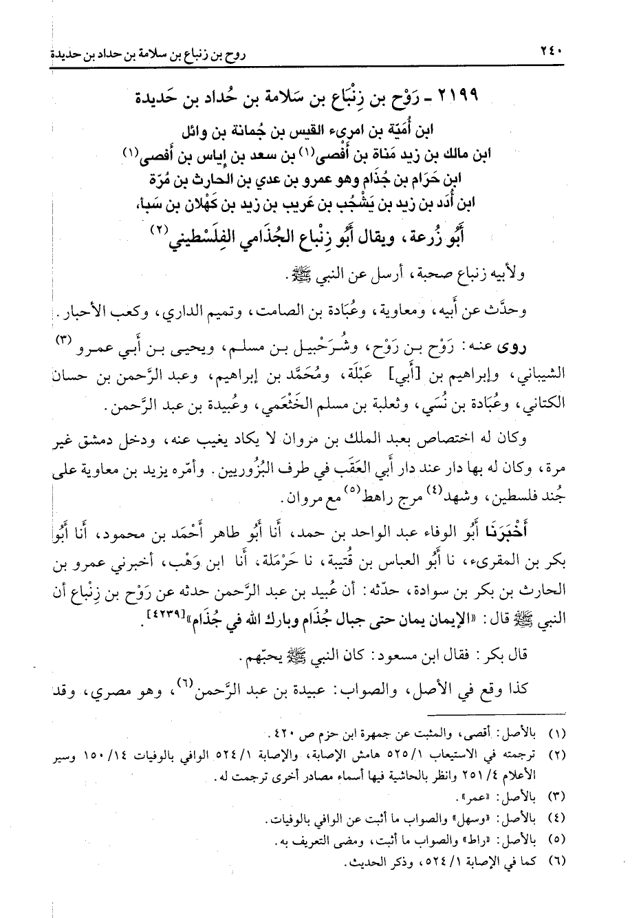 2199 - روح بن زنباع بن سلامة بن حداد بن حديدة ابن أمية بن امرئ القيس بن جمانة بن وائل ابن مالك بن زيد مناة بن أفصى (1) بن سعد بن إياس بن أفصى (1) ابن حرام بن جذام وهو عمرو بن عدي بن الحارث بن مرة ابن أدد بن زيد بن يشجب بن عريب بن كهلان بن سبأ أبو زرعة يقال أبو زنباع الجذامي الفلسطيني (2) ولأبيه زنباع صحبة أرسل عنه النبي (صلى الله عليه وسلم) وحدث عن أبيه ومعاوية وعبادة بن الصامت وتميم الداري وكعب الأحبار روى عنه روح بن روح وشرحبيل بن مسلم ويحيى بن أبي عمرو (3) الشيباني وإبراهيم بن أبي عبلة ومحمد بن إبراهيم وعبد الرحمن بن حسان الكتاني وعبادة بن نسي وثعلبة بن مسلم الخثعمي وعبيدة بن عبد الرحمن وكان له اختصاص بعبد الملك بن مروان لا يكاد يغيب بن عنه ودخل دمشق غير مرة وكان له بها دار عند دار أبي العقب في طرف البزوريين وأمره يزيد بن معاوية على جند فلسطين وشهد (4) مرج راهط (5) مع مروان أخبرنا أبو الوفاء عبد الواحد بن حمد أنا أبو طاهر أحمد بن محمود أنا أبو بكر بن المقرئ نا أبو العباس بن قتيبة نا حرملة أنا بن وهب أخبرني عمرو بن الحارث بن بكر بن سوادة حدثه أن عبيد بن عبد الرحمن حدثه عن روح بن زنباع أن النبي (صلى الله عليه وسلم) قال الإيمان يمان حتى جبال جذام وبارك الله في جذام قال بكر فقال ابن مسعود كان النبي يحبهم كذا وقع في الأصل والصواب عبيدة بن عبد الرحمن (6) وهو مصري وقد
