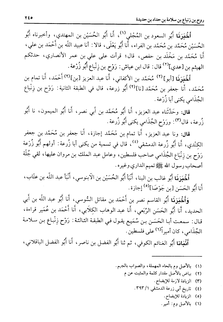أخبرنا أبو السعود بن المجلي (1) أنا أبو الحسين بن المهتدي وأخبرناه أبو الحسين محمد بن محمد بن الفراء أنا أبو يعلى قالا أنا عبيد الله بن أحمد بن علي أنا محمد بن مخلد بن حفص قال قرأت على علي بن عمر الأنصاري حدثكم الهيثم بن عدي (2) قال قال ابن عياش روح بن زنباع أبو زرعة أخبرنا أبو (2) محمد بن الأكفاني أنا عبد العزيز بن (2) أحمد أنا تمام بن محمد أنا جعفر بن محمد نا (2) أبو زرعة قال في الطبقة الثانية روح بن زنباع الجذامي يكنى أبا زرعة قال وحدثناه عبد العزيز أنا أبو محمد بنأبي نصر أنا أبو الميمون نا أبو زرعة قال (3) وروح الجذامي يكنى أبو زرعة قال ونا عبد العزيز أنا تمام بن محمد إجازة أنا جعفر بن محمد بن جعفر الكندي أنا أبو زرعة الدمشقي (4) قال في تسمية من يكنى أبا زرعة أولهم أبو زرعة روح بن زنباع الجذامي صاحب فلسطين وعامل عبد الملك بن مروان عليها لقي جلة أصحاب رسول الله (صلى الله عليه وسلم) تميم الداري وغيره أخبرنا أبو غالب بن البنا أنبأ أبو الحسين بن بنت الآبنوسي أنبأ عبد الله بن عتاب أنا أبو الحسن بن جوصا (5) إجازة وأخبرنا أبو القاسم نصر بن أحمد بن مقاتل السوسي أنا أبو عبد الله بن أبي الحديد أنا أبو الحسن الربعي أنا عبد الوهاب الكلابي أنا أحمد بن عمير قراءة قال سمعت أبا الحسن بن سميع يقول في الطبقة الثالثة روح زنباع بن سلامة الجذامي كان أميرا (6) على فلسطين أنبأنا أبو الغنائم الكوفي ثم ثنا أبو الفضل بن ناصر أنا أبو الفضل الباقلاني