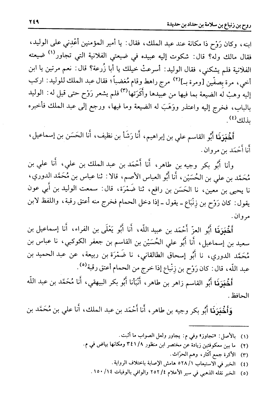 ابنه وكان روح ذا مكانة عند عبد الملك فقال يا أمير المؤمنين أعدني على الوليد فقال مالك وله قال شكوت إليه عبيده في ضيعتي الفلانية التي تجاور (1) ضيعته الفلانية فلم يشكني فقال الوليد أسرعت خيلك يا أبا زرعة قال نعم مرتين يا ابن أخي مرة بصفين ومرة (2) مرج راهط وقام مغضبا فقال عبد الملك للوليد اركب إليه وهب له الضيعة بما فيها من عبيدها وأكرتها (3) فلم يشعر روح حتى قيل له الوليد بالباب فخرج إليه واعتذر ووهب له الضيعة وما فيها ورجع إلى عبد الملك فأخبره (4) بذلك أخبرنا أبو القاسم علي بن إبراهيم أنا رشأ بن نظيف أنا الحسن بن إسماعيل أنا أحمد بن مروان وأنا أبو بكر وجيه بن طاهر أنا أحمد بن عبد الملك بن علي أنا علي بن محمد بن علي بن الحسين أنا أبو العباس الأصم قالا ثنا عباس بن محمد الدوري نا يحيى بن معين نا الحسن بن رافع ثنا ضمرة قال سمعت الوليد بن أبي عون يقول كان روح بن زنباع يقول إذا دخل الحمام فخرج منه أعتق رقبة واللفظ لابن مروان أخبرنا أبو العز أحمد بن عبيد الله أنا أبو يعلى بن الفراء أنا إسماعيل بن سعيد بن إسماعيل أنا أبو علي الحسين بن القاسم بن جعفر الكوكبي نا عباس بن محمد الدوري نا أبو إسحاق الطالقاني نا ضمرة بن ربيعة عن عبد الحميد بن عبد الله قال كان روح بن زنباع إذا خرج من الحمام أعتق رقبة (5) أخبرنا أبو القاسم زاهر بن طاهر أنبأنا أبو بكر البيهقي أنا محمد بن عبد الله الحافظ وأخبرنا أبو بكر وجيه بن طاهر أنا أحمد بن عبد الملك أنا علي بن محمد بن