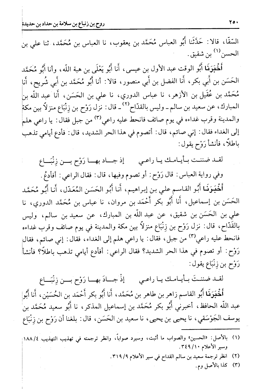 السقا قالا حدثنا أبو العباس محمد بن يعقوب نا العباس بن محمد ثنا علي بن الحسن (1) بن شقيق أخبرنا أبو الوقت عبد الأول بن عيسى أنا أبو يعلى بن هبة الله وأنا أبو محمد الحسن بنأبي بكر أنا الفضل بنأبي منصور قالا أنا أبو محمد بن أبي شريح أنا محمد بن عقيل بن الأزهر نا عباس الدوري نا علي بن الحسن أنا عبد الله بن المبارك عن سعيد بن سالم وليس بالقداح (2) قال نزل روح بن زنباع منزلا بين مكة والمدينة وقرب غداءه في يوم صائف فانحط عليه راعي (3) من جبل فقال يا راعي هلم إلى الغداء فقال إني صائم قال أتصوم في هذا الحر الشديد قال فأدع أيامي تذهب باطلا فأنشأ روح يقول لقد ضننت بأيامك يا راعي * إذ جاد بها روح بن زنباع * وفي رواية العباس قال روح أو تصوم وفيها قال فقال الراعي أفأدع أخبرنا أبو القاسم علي بن إبراهيم أنا أبو الحسن المعدل أنا أبو محمد الحسن بن إسماعيل أنا أبو بكر أحمد بن مروان نا عباس بن محمد الدوري نا علي بن الحسن بن شقيق عن عبد الله بن المبارك عن سعيد بن سالم وليس بالقداح قال نزل روح بن زنباع منزلا بين مكة والمدينة في يوم صائف وقرب غداءه فانحط عليه راعي (3) من جبل فقال يا راعي هلم إلى الغداء فقال إني صائم فقال روح أو تصوم في هذا الحر الشديد فقال الراعي أفأدع أيامي تذهب باطلا فأنشأ روح بن زنباع يقول * لقد ضننت بأيامك يا راعي * إذ جاد بها روح بن زنباع * أخبرنا أبو القاسم زاهر بن طاهر بن محمد أنا أبو بكر أحمد بن الحسين أنا أبو عبد الله الحافظ أخبرني أبو بكر محمد بن إسماعيل المذكر نا أبو سعيد محمد بن يوسف الجوسقي نا يحيى بن يحيى نا سعيد بن الحسن قال بلغنا أن روح بن زنباع