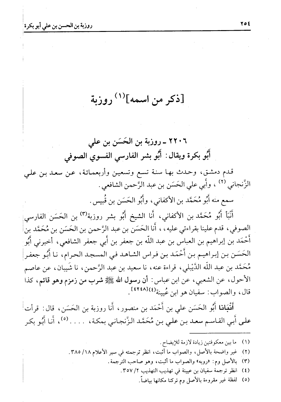 2206 - روزبة بن الحسن بن علي أبو بكرة ويقال أبو بشر الفارسي الفسوي الصوفي قدم دمشق وحدث بها سنة تسع وتسعين وأربعمائة عن سعد بن علي الزنجاني (2) وأبي علي الحسن بن عبد الرحمن الشافعي سمع منه أبو محمد بن الأكفاني وأبو الحسن بن قبيس أنبأ أبو محمد بن الأكفاني أنا الشيخ أبو بشر روزبة (3) بن الحسن الفارسي الصوفي قدم علينا بقراءتي عليه أنا الحسن بن عبد الرحمن بن الحسن بن محمد بن أحمد بن إبراهيم بن العباس بن عبد الله بن جعفر بنأبي جعفر الشافعي أخبرني أبو الحسن بن إبراهيم بنأحمد بن فراس الشاهد في المسجد الحرام نا أبو جعفر محمد بن عبد الله الديبلي قراءة عنه نا سعيد بن عبد الرحمن نا شيبان عن عاصم الأحول عن الشعبي عن ابن عباس أن رسول الله (صلى الله عليه وسلم) شرب من زمزم وهو قائم كذا قال والصواب سفيان هو ابن عيينة ح (4) أنبأنا أبو الحسن علي بن أحمد بن منصور أنا روزبة بن الحسن قال قرأت على أبي القاسم سعد بن علي بن محمد الزنجاني بمكة (5) أنا أبو بكر