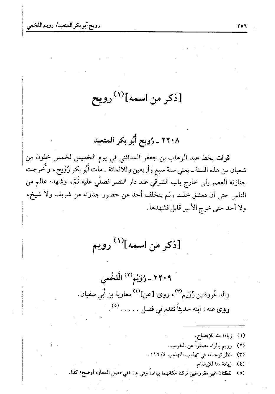 2209 - رويم (2) اللخمي والد عروة بن رويم (3) روى عن (4) معاوية بن أبي سفيان روى عنه ابنه حديثا تقدم في فصل (5)