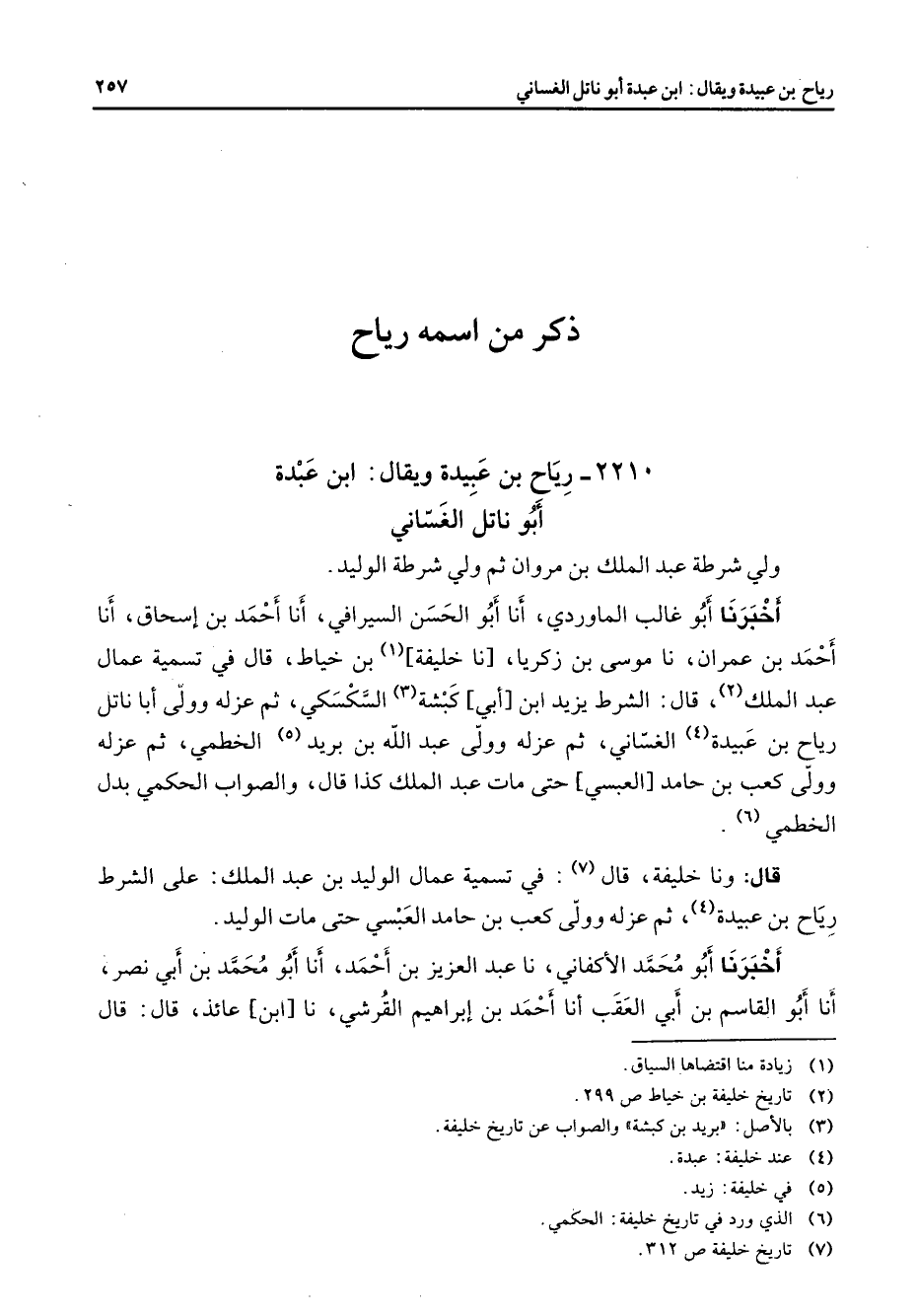 2210 - رياح بن عبيدة ويقال ابن عبدة أبو ناتل الغساني ولي شرطة عبد الملك بن مروان ثم ولي شرطة الوليد أخبرنا أبو غالب الماوردي أنا أبو الحسن السيرافي أنا أحمد بن إسحاق أنا أحمد بن عمران نا موسى بن زكريا نا خليفة (1) بن خياط قال في تسمية عمال عبد الملك (2) قال الشرط يزيد ابن أبي كبشة (3) السكسكي ثم عزله وولى أبا ناتل رياح بن عبيدة (4) الغساني ثم عزله وولى عبد الله بن بريد (5) الخطمي ثم عزله وولى كعب بن حامد العبسي حتى مات عبد الملك كذا قال والصواب الحكمي بدل الخطمي (6) قال ونا خليفة قال (7) في تسمية عمال الوليد بن عبد الملك على الشرط رياح بن عبيدة (4) ثم عزله وولى كعب بن حامد العبسي حتى مات الوليد أخبرنا أبو محمد الاكفاني نا عبد العزيز بن أحمد أنا أبو محمد بن أبي نصر أنا أبو القاسم بن أبي العقب أنا أحمد بن إبراهيم القرشي نا ابن عائذ قال قال