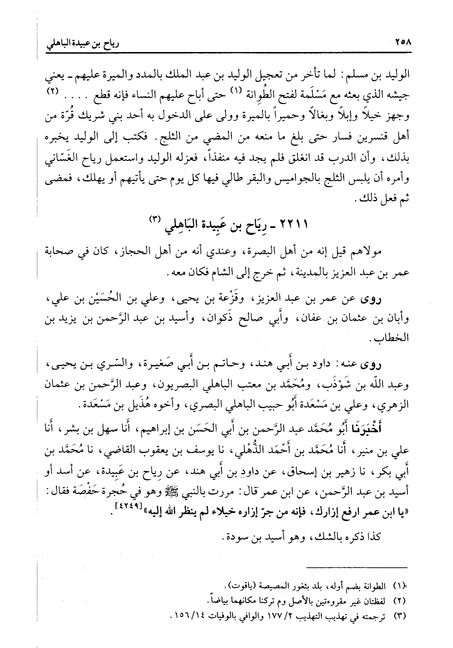 2211 - رياح بن عبيدة الباهلي (3) مولاهم قيل إنه من أهل البصرة وعندي أنه من أهل الحجاز كان في صحابة عمر بن عبد العزيز بالمدينة ثم خرج إلى الشام فكان معه روى عن عمر بن عبد العزيز وقزعة بن يحيى وعلي بن الحسين بن علي وأبان بن عثمان وأبي صالح ذكوان وأسيد بن عبد الرحمن بن يزيد بن الخطاب روى عنه داود بن أبي هند وحاتم بن أبي صغيرة والسري بن يحيى وعبد الله بن شوذب ومحمد بن معتب الباهلي البصريون وعبد الرحمن بن عثمان الزهري وعلي بن مسعدة أبو حبيب الباهلي البصري وأخوه هذيل بن مسعدة أخبرنا أبو محمد عبد الرحمن بنابي الحسن بن إبراهيم أنا سهل بن بشر أنا علي بن منير أنا محمد بن أحمد الذهلي نا يوسف بن يعقوب القاضي نا محمد بن أبي بكر نا زهير بن إسحاق عن داود بن أبي هند عن رياح بن عبيدة عن أسد أو أسيد بن عبد الرحمن عن ابن عمر قال مررت بالنبي (صلى الله عليه وسلم) وهو في حجرة حفصة فقال يا ابن عمر ارفع إزارك فإنه من جر إزاره خيلاء لم ينظر الله إليه كذا ذكره بالشك وهو أسيد بن سودة