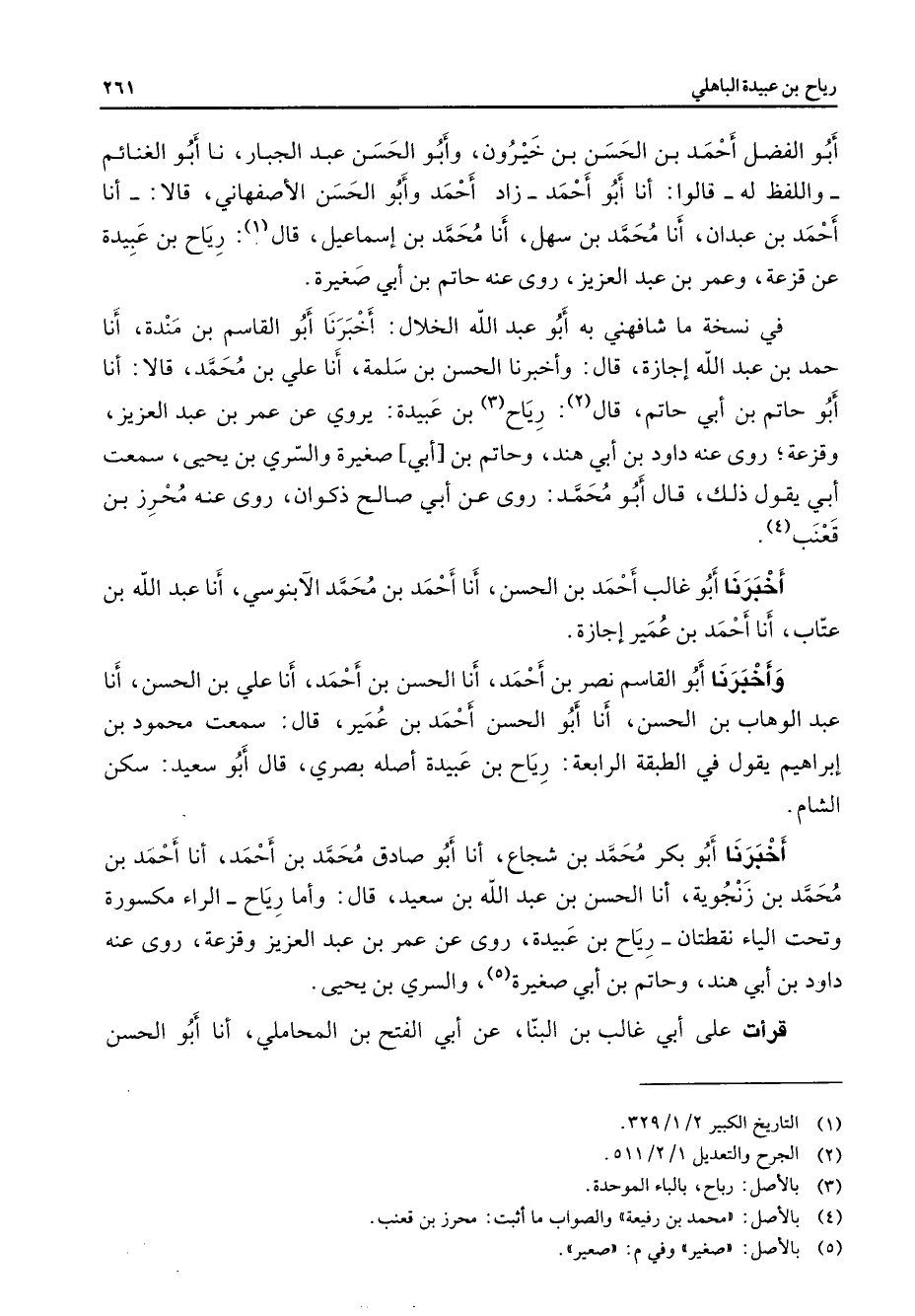 أبو الفضل أحمد بن الحسن بن خيرون وأبو الحسن عبد الجبار نا أبو الغنائم واللفظ له قالوا أنا أبو أحمد زاد أحمد وأبو الحسن الأصفهاني قالا أنا أحمد بن عبدان أنا محمد بن سهل أنا محمد بن إسماعيل قال (1) رياح بن عبيدة عن قزعة وعمر بن عبد العزيز روى عنه حاتم بن أبي صغيرة في نسخة ما شافهني به أبو عبد الله الخلال أخبرنا أبو القاسم بن مندة أنا حمد بن عبد الله إجازة قال وأخبرنا الحسن بن سلمة أنا علي بن محمد قالا أنا أبو حاتم بن أبي حاتم قال (2) رياح (3) بن عبيدة يروي عن عمر بن عبد العزيز وقزعة روى عنه داود بنأبي هند وحاتم بن أبي صغيرة والسري بن يحيى سمعت أبي يقول ذلك قال أبو محمد روى عن أبي صالح ذكوان روى عنه محرز بن قعنب (4) أخبرنا أبو غالب أحمد بن الحسن أنا أحمد بن محمد الآبنوسي أنا عبد الله بن عتاب أنا أحمد بن عمير إجازة وأخبرنا أبو القاسم نصر بن أحمد أنا الحسن بنأحمد أنا علي بن الحسن أنا عبد الوهاب بن الحسن أنا أبو الحسن أحمد بن عمير قال سمعت محمود بن إبراهيم يقول في الطبقة الرابعة رياح بن عبيدة أصله بصري قال أبو سعيد سكن الشام أخبرنا أبو بكر محمد بن شجاع أنا أبو صادق محمد بن أحمد أنا أحمد بن محمد بن زنجوية أنا الحسن بن عبد الله بن سعيد قال وأما رياح الراء مكسورة وتحت الياء نقطتان رياح بن عبيدة روى عن عمر بن عبد العزيز وقزعة روى عنه داود بن أبي هند وحاتم ابن أبي صغيرة (5) والسري بن يحيى قرأت على أبي غالب بن البنا عنابي الفتح بن المحاملي أما أبو الحسن