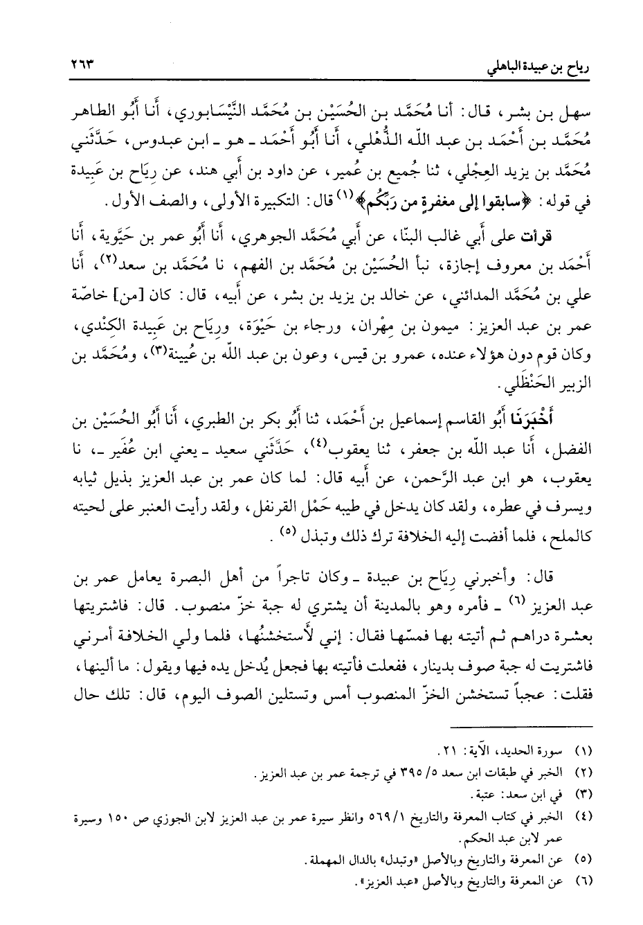 سهل بن بشر قال أنا محمد بن الحسين بن محمد النيسابوري أنا أبو الطاهر محمد بنأحمد بن عبد الله الذهلي أنا أبو أحمد هو ابن عبدوس حدثني محمد بن يزيد العجلي ثنا جميع بن عمير عن داود بن أبي هند عن رياح بن عبيدة في قوله " سابقوا إلى مغفرة من ربكم " (1) قال التكبيرة الأولى والصف الأول قرأت على أبي غالب البنا عنأبي محمد الجوهري أنا أبو عمر بن حيوية أنا أحمد بن معروف إجازة نبأ الحسين بن محمد بن الفهم نا محمد بن سعد (2) أنا علي بن محمد المدائني عن خالد بن يزيد بن بشر عنأبيه قال كان من خاصة عمر بن عبد العزيز ميمون بن مهر غليهان ورجاء بن حيوة ورياح بن عبيدة الكندي وكان قوم دون هؤلاء عنده عمرو بن قيس وعون بن عبد الله بن عيينة (3) ومحمد بن الزبير الحنظلي أخبرنا أبو القاسم إسماعيل بن أحمد ثنا أبو بكر بن الطبري أنا أبو الحسين بن الفضل أنا عبد الله بن جعفر ثنا يعقوب (4) حدثني سعيد يعني ابن عفير نا يعقوب هو ابن عبد الرحمن عن أبيه قال لما كان عمر بن عبد العزيز بذيل ثيابه ويسرف في عطره ولقد كان يدخل في طيبه حمل القرنفل ولقد رأيت العنبر على لحيته كالملح فلما أفضت إليه الخلافة ترك ذلك وتبذل (5) قال وأخبرني رياح بن عبيدة وكان تاجرا من أهل البصرة يعامل عمر بن عبد العزيز (6) فأمره وهو بالمدينة أن يشتري له جبة خز منصوب قال فاشتريتها بعشرة دراهم ثم أتيته بها فمسها فقال إني لأستخشنها فلما ولي الخلافة أمرني فاشتريت له جبة صوف بدينار ففعلت فأتيته بها فجعل يدخل يده فيها ويقول ما ألينها فقلت عجبا تستخشن الخز المنصوب أمس وتستلين الصوف اليوم قال تلك حال