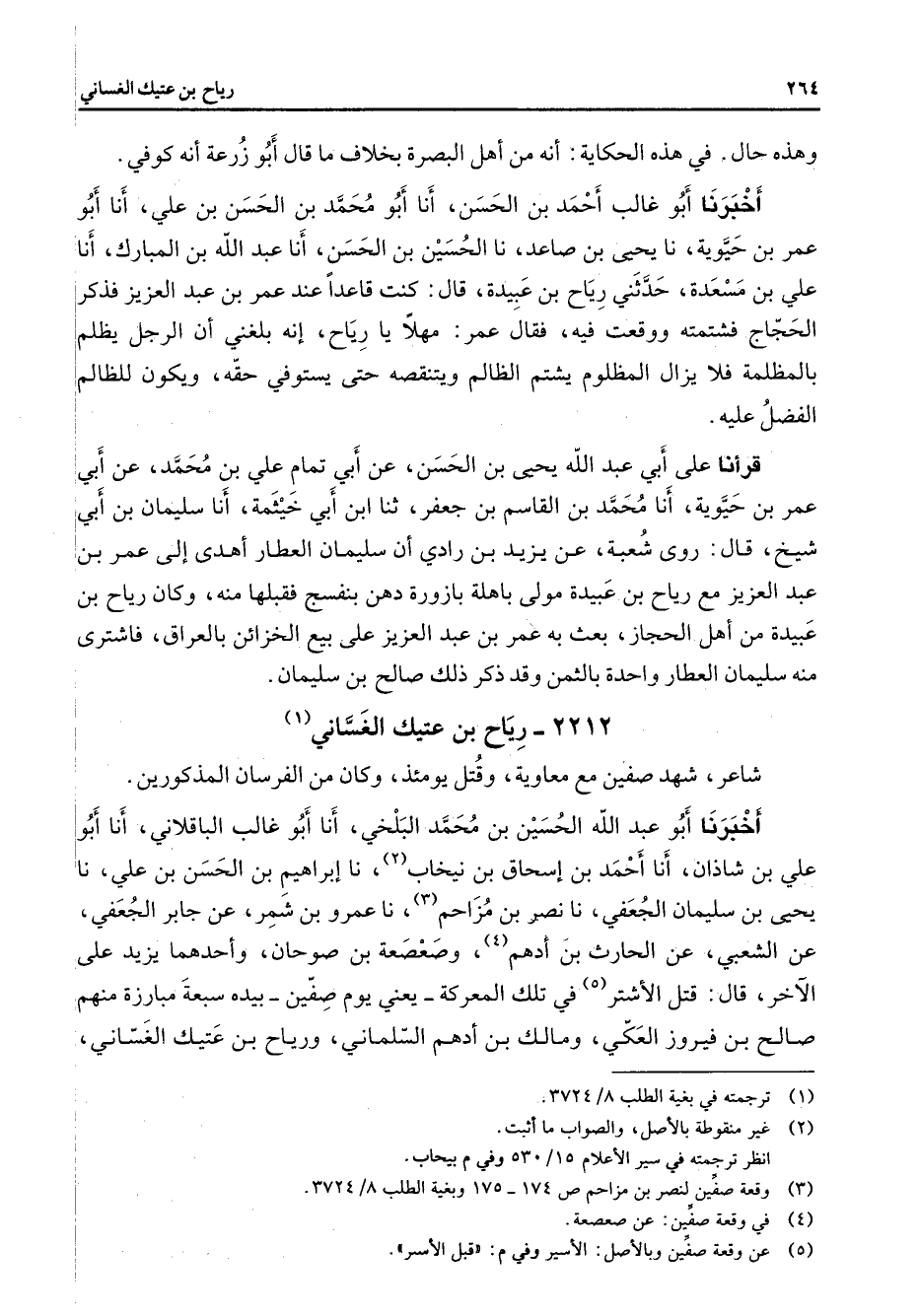 2212 - رياح بن عتيك الغساني (1) شاعر شهد صفين مع معاوية وقتل يومئذ وكان من الفرسان المذكورين أخبرنا أبو عبد الله الحسين بن محمد البلخي أنا أبو غالب الباقلاني أنا أبو علي بن شاذان أنا أحمد بن إسحاق بن نيخاب (2) نا إبراهيم بن الحسن بن علي نا يحيى بن سليمان الجعفي نا نصر بن مزاحم (3) نا عمرو بن شمر عن جابر الجعفي عن الشعبي عن الحارث بن أدهم (4) وصعصعة بن صوحان وأحدهما يزيد على الآخر قال قتل الأشتر (5) في تلك المعركة يعني يوم صفين بيده سبعة مبارزة منهم صالح بن فيروز العكي ومالك بن أدهم السلماني ورياح بن عتيك الغساني