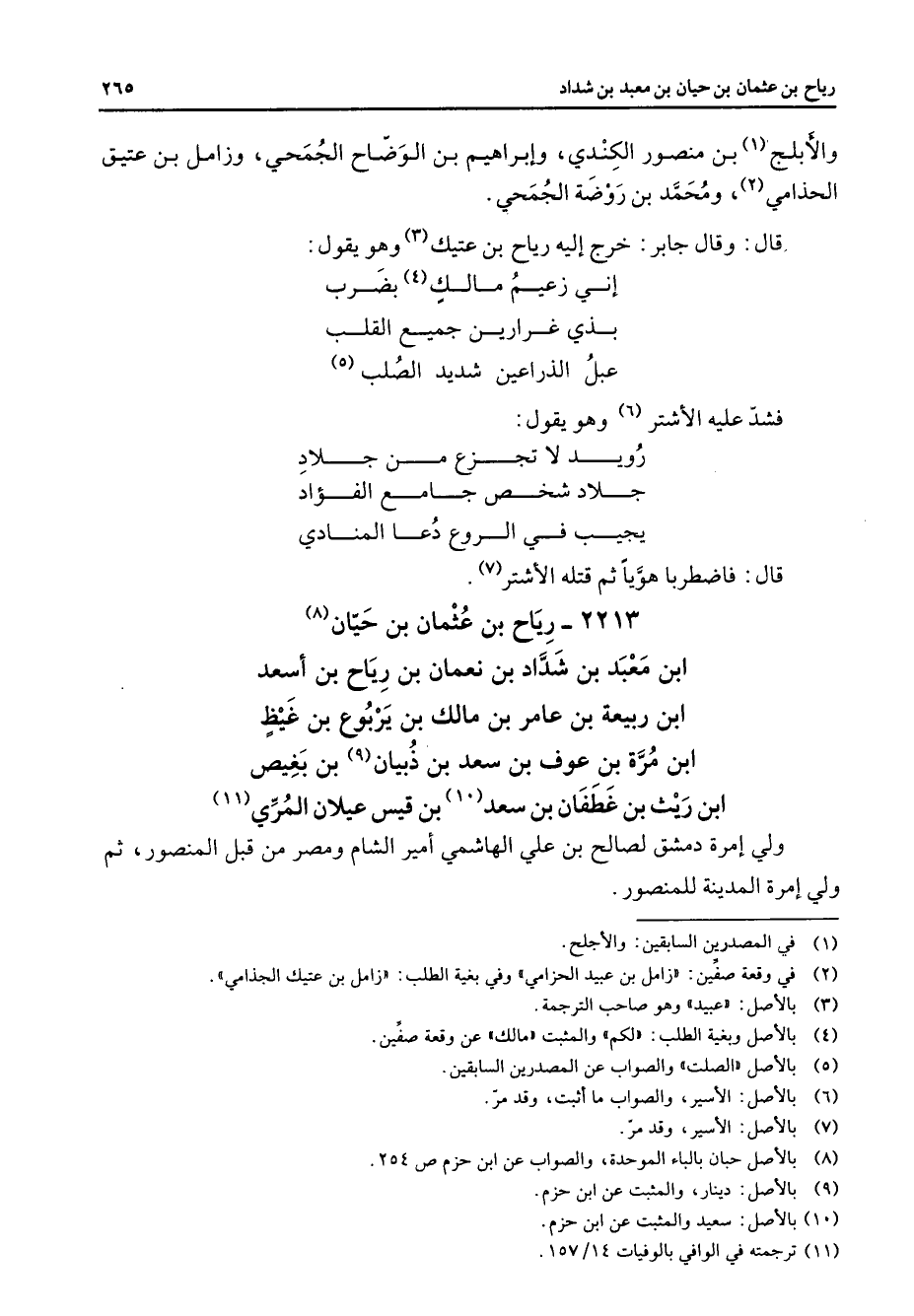 2213 - رياح بن عثمان بن حيان (8) ابن معبد بن شداد بن نعمان بن رياح بنأسعد ابن ربيعة بن عامر بن مالك بن يربوع بن غيظ ابن مرة بن عوف بن سعد بن ذبيان (9) بن بغيص ابن ريث بن غطفان بن سعد (10) بن قيس عيلان المري (11) ولي إمرة دمشق لصالح بن علي الهاشمي أمير الشام ومصر من قلب المنصور ثم ولي إمرة المدينة للمنصور