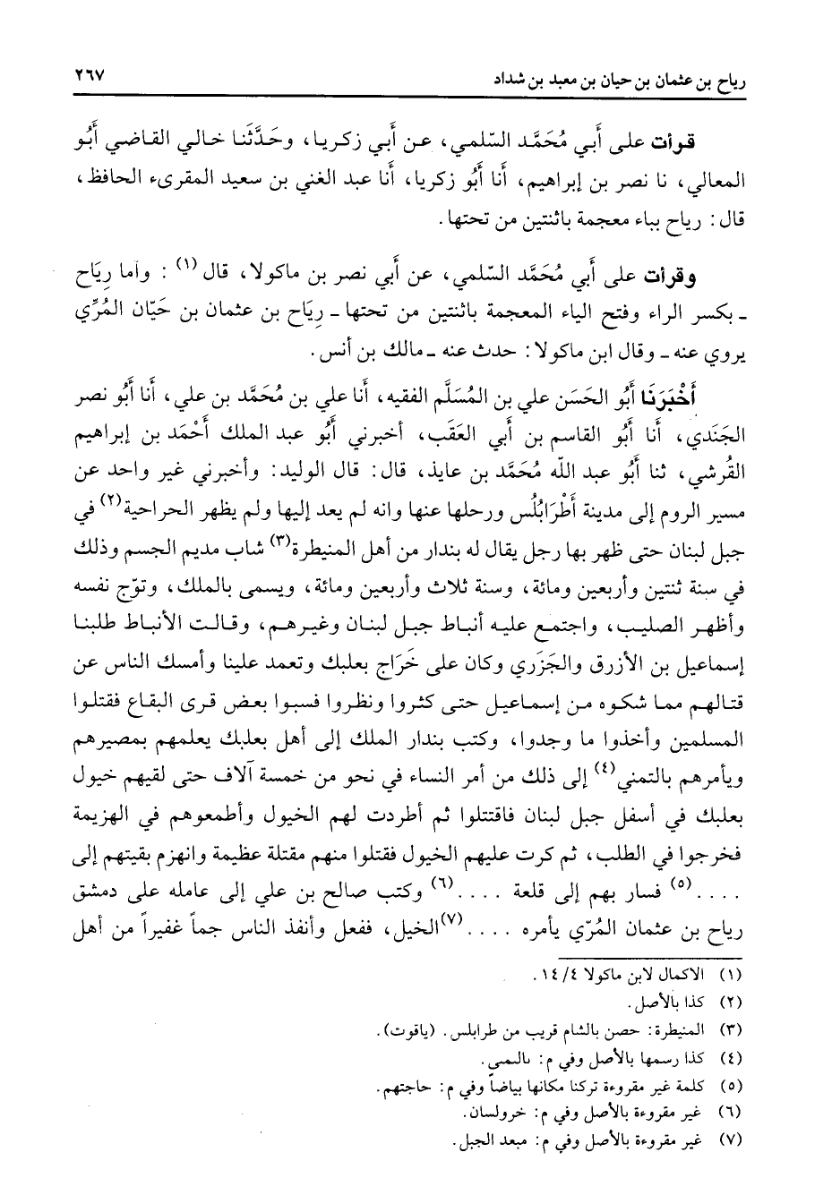 قرأت على ابي محمد السلمي عن أبي زكريا وحدثنا خالي القاضي أبو المعالي نا نصر بن إبراهيم أنا أبو زكريا أنا عبد الغني بن سعيد المقرئ الحافظ قال رياح بباء معجمة باثنتين من تحتها وقرأت على أبي محمد السلمي عن أبي نصر بن ماكولا قال (1) وأما رياح بكسر الراء وفتح الياء المعجمة باثنتين من تحتها رياح بن عثمان بن حيان المري يروي عنه وقال ابن ماكولا حدث عنه مالك بن أنس أخبرنا أبو الحسن علي بن المسلم الفقيه أنا علي بن محمد بن علي أنا أبو نصر الجندي أنا أبو القاسم بن أبي العقب أخبرني أبو عبد الملك أحمد بن إبراهيم القرشي ثنا أبو عبد الله محمد بن عايذ قال قال الوليد وأخبرني غير واحد عن مسير الروم إلى مدينة أطرابلس ورحلها عنها وانه لم يعد إليها ولم يظهر الحراحية (2) في جبل لبنان حتى ظهر بها رجل يقال له بندار من أهل المنيطرة (3) شاب مديم الجسم وذلك في سنة ثنتين وأربعين ومائة وسنة ثلاث وأربعين ومائة ويسمى بالملك وتوج نفسه وأظهر الصليب واجتمع عليه أنباط جبل لبنان وغيرهم وقالت الأنباط طلبنا إسماعيل بن الأزرق والجزري وكان على خراج بعلبك علينا وأمسك الناس عن قتالهم مما شكوه من إسماعيل حتى كثروا ونظروا فسبوا بعض قرى البقاع فقتلوا المسلمين وأخذوا ما وجدوا وكتب بندار الملك إلى أهل بعلبك يعلمهم بمصيرهم ويأمرهم بالتمني (4) إلى ذلك منأمر النساء في نحو خمسة آلاف حتى لقيهم خيول بعلبك في أسفل جبل لبنان فاقتتلوا ثم أطردت لهم الخيول وأطمعوهم في الهزيمة فخرجوا في الطلب ثم كرت عليهم الخيول فقتلوا منهم مقتلة عظيمة وانهزم بقيتهم إلى (5) فسار بهم إلى قلعة (6) وكتب صالح بن علي إلى عامله على دمشق رياح بن عثمان المري يأمره (7) الخيل ففعل وأنفذ الناس جما غفيرا من أهل