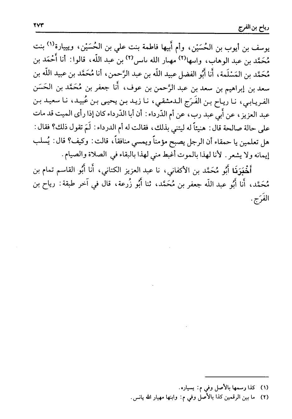 يوسف بن أيوب بن الحسين وأم أبيها فاطمة بنت علي بن الحسين ويييارة (1) بنت محمد بن عبد الوهاب وأبيها (2) مهيار الله يانس (3) بن عبد الله قالوا أنا أحمد بن محمد بن المسلمة أنا أبو الفضل عبيد الله بن عبد الرحمن أنا محمد بن عبيد الله بن سعد بن إبراهيم بن سعد بن عبد الرحمن بن عوف أنا جعفر بن محمد بن الحسن الفريابي نا رياح بن الفرج الدمشقي نا زيد بن يحيى بن عبيد نا سعيد بن عبد العزيز عن أبي عبد رب عن أم الدرداء كان إذا رأى الميت قد مات على حالة صالحة قال هنيئا له ليتني بذلك فقالت له أم الدرداء لم تقول ذلك فقال هل تعلمين يا حمقاء أن الرجل يصبح مؤمنا ويمسي منافقا قالت وكيف قال يسلب إيمانه ولا يشعر لأنا لهذا بالموت أغبط مني لهذا بالبقاء في الصلاة والصيام أخبرنا أبو محمد بن الأكفاني نا عبد العزيز الكتاني أنا أبو القاسم تمام بن محمد أنا أبو عبد الله جعفر بن محمد ثنا أبو زرعة قال في آخر طبقة رياح بن الفرج