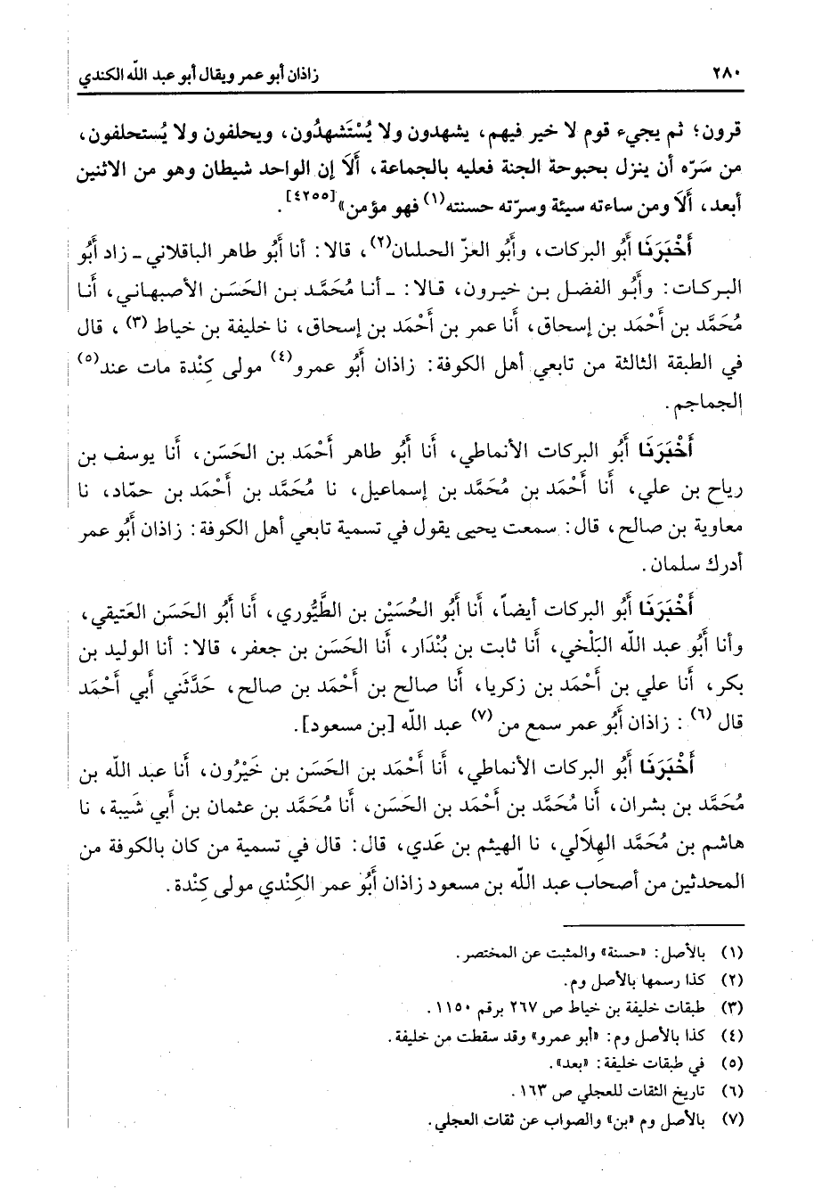 قرون ثم يجئ قوم لا خير فيهم يشهدون ولا يستشهدون ويحلفون ولا يستحلفون من سره أن ينزل بحبوحة الجنة فعليه بالجماعة ألا إن الواحد شيطان وهو من الاثنين أبعد ألا ومن ساءته سيئته وسرته حسنته (1) فهو مؤمن أخبرنا أبو البركات وأبو العز الحسلسان (2) قالا أنا أبو طاهر الباقلاني زاد أبو البركات وأبو الفضل بن خيرون قالا أنا محمد بن الحسن الأصبهاني أنا محمد بن أحمد بن إسحاق أنا عمر بن أحمد بن إسحاق نن خليفة بن خياط (3) قال في الطبقة الثالثة من تابعي أهل الكوفة زاذان أبو عمرو (4) مولى كندة مات عند (5) الجماجم أخبرنا أبو البركات الأنماطي أنا أبو طاهر أحمد بن الحسن أنا يوسف بن رياح بن علي أنا أحمد بن محمد بن إسماعيل نا محمد بن أحمد بن حماد نا معاوية بن صالح قال سمعت يحيى يقول في تسمية تابعي أهل الكوفة زاذان أبو عمر أدرك سلمان أخبرنا أبو البركات أيضا أنا أبو الحسين بن الطيوري أنا أبو الحسن العتيقي وأنا أبو عبد الله البلخي أنا ثابت بن بندار أنا الحسن بن جعفر قالا أنا الوليد بن بكر أنا علي بن أحمد بن زكريا أنا صالح بنأحمد بنصالح حدثني أبي أحمد قال (6) زاذان أبو عمر سمع من (7) عبد الله بن مسعود أخبرنا أبو البركات الأنماطي أنا أحمد بن الحسن بن خيرون أنا عبد الله بن محمد بن بشران أنا محمد بن أحمد بن الحسن أنا محمد بن عثمان بن أبي شيبة نا هاشم بن محمد الهلالي نا الهيثم بن عدي قال قال في تسمية من كان بالكوفة من المحدثين من أصحاب عبد الله بن مسعود زاذان أبو عمر الكندي مولى كندة