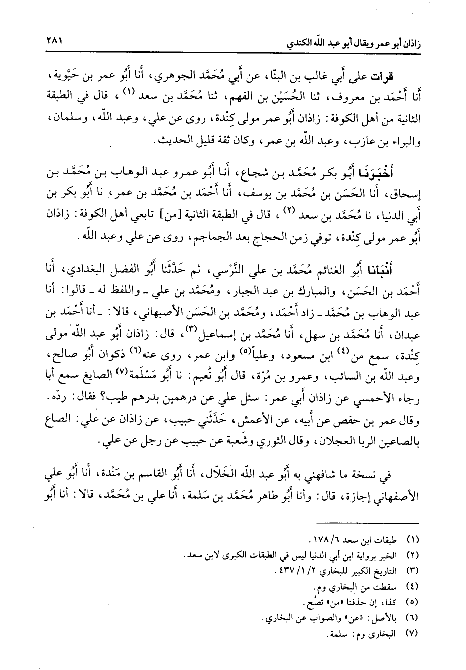 قرأت على أبي غالب بن البنا عن أبي محمد الجوهري أنا أبو عمر بن حيوية أنا أحمد بن معروف ثنا الحسين بن الفهم ثنا محمد بن سعد (1) قال في الطبقة الثانية من أهل الكوفة زاذان أبو عمر مولى كندة روى عن علي وعبد الله وسلمان والبراء بن عازب وعبد الله بن عمر وكان ثقة قليل الحديث أخبرنا أبو بكر محمد بن شجاع أنا أبو عمرو عبد الوهاب بن محمد بن إسحاق أنا الحسن بن محمد بن يوسف أنا أحمد بن محمد بن عمر نا أبو بكر بن أبي الدنيا نا محمد بن سعد (2) قال في الطبقة الثانية من تابعي أهل الكوفة زاذان أبو عمر مولى كندة توفي زمن الحجاج بعد الجماجم روى عن علي وعبد الله أنبأنا أبو الغنائم محمد بن علي النرسي ثم حدثنا أبو الفضل البغدادي أنا أحمد بن الحسن والمبارك بن عبد الجبار ومحمد بن علي واللفظ له قالوا أنا عبد الوهاب بن محمد زاد أحمد ومحمد بن الحسن الأصبهاني قالا أنا أحمد بن عبدان أنا محمد بن سهل أنا محمد بن إسماعيل (3) قال زاذان أبو عبد الله مولى كندة سمع من (4) ابن مسعود وعليا (5) وابن عمر روى عنه (6) ذكوان أبو صالح وعبد الله بن السائب وعمرو بن مرة قال أبو نعيم نا أبو مسلمة (7) الصايغ سمع أبا رجاء الأحمسي عن زاذان أبي عمر سئل علي عن درهمين بدرهم طيب فقال رده وقال عمر بن حفص عن أبيه عن الأعمش حدثني حبيب عن زاذان عن علي الصاع بالصاعين الربا العجلان وقال الثوري وشعبة عن حبيب عن رجل عن علي في نسخة ما شافهني به أبو عبد الله الخلال أنا أبو القاسم بن مندة أنا أبو علي الأصفهاني إجازة قال وأنا أبو طاهر محمد بن سلمة أنا علي بن محمد قالا أنا أبو
