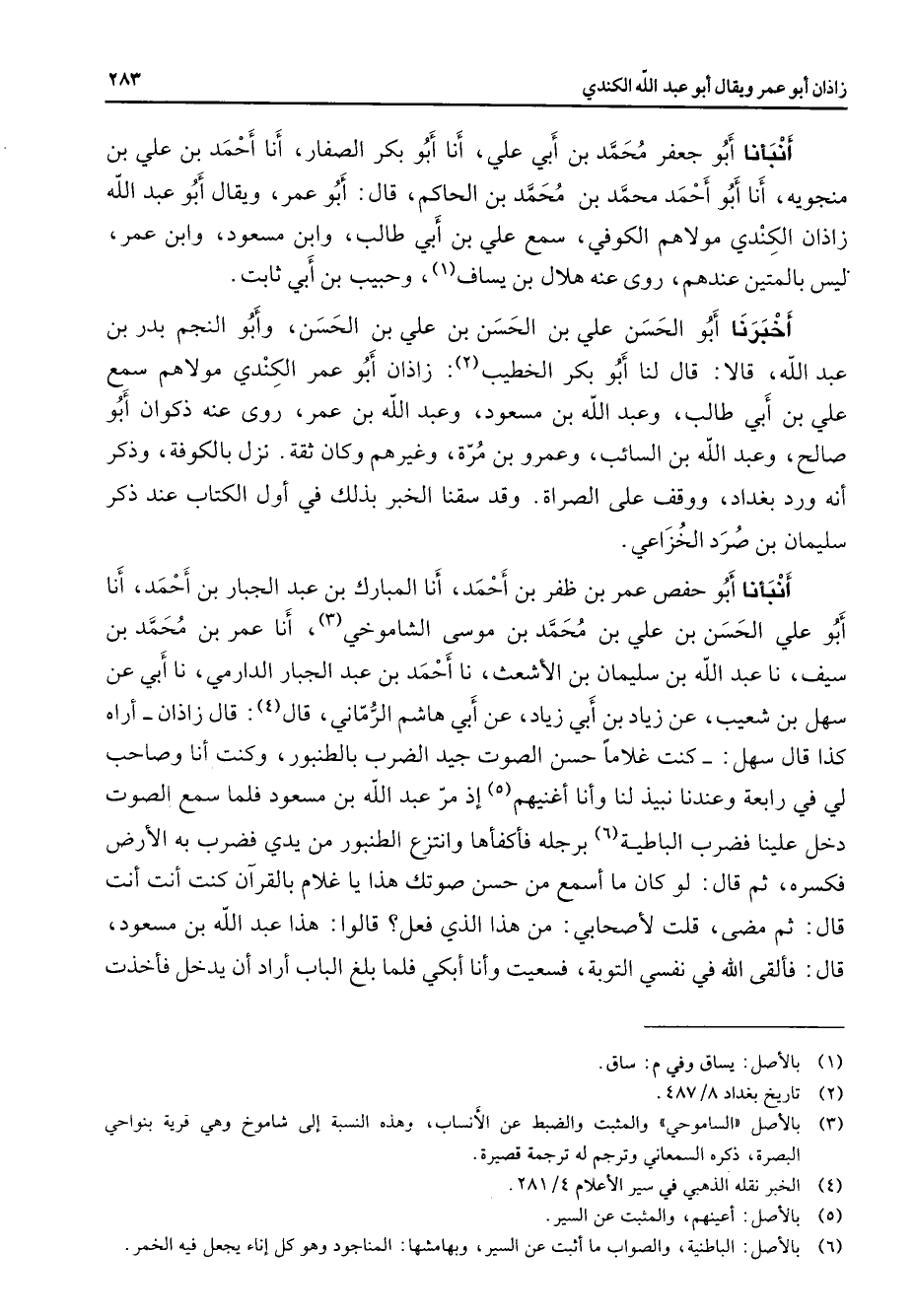 أنبأنا أبو جعفر محمد بن أبي علي أنا أبو بكر الصفار أنا أحمد بن علي بن منجويه أنا أبو أحمد محمد بن محمد بن الحاكم قال أبو عمر ويقال أبو عبد الله زاذان الكندي مولاهم الكوفي سمع علي بن أبي طالب وابن مسعود وابن عمر ليس بالمتين عندهم روى عنه هلال بن يساف (1) وحبيب بن أبي ثابت أخبرنا أبو الحسن علي بن الحسن بن علي بن الحسن وأبو النجم بدر بن عبد الله قالا لنا أبو بكر الخطيب (2) زاذان أبو عمر الكندي مولاهم سمع علي بن أبي طالب وعبد الله بن مسعود وعبد الله بن عمر روى عنه ذكوان أبو صالح وعبد الله بن السائب وعمرو بن مرة وغيرهم وكان ثقة نزل بالكوفة وذكر أنه ورد بغداد وقف على الصراة وقد سقنا الخبر بذلك في أول الكتاب عند ذكر سليمان بن صرد الخزاعي أنبأنا أبو حفص عمر بن ظفر بن أحمد أنا المبارك بن عبد الجبار بن أحمد أنا أبو علي الحسن بن علي بن محمد بن موسى الشاموخي (3) أنا عمر بن محمد بن سيف نا عبد الله بن سليمان بن الأشعث نا أحمد بن عبد الجبار الدارمي نا أبي عن سهل بن شعيب عن زياد بنأبي زياد عن أبي هاشم الرماني قال (4) قال زاذان أراه كذا قال سهل كنت غلاما حسن الصوت جيد الضرب بالطنبور وكنت أنا وصاحب لي في رابعة وعندنا نبيذ لنا وأنا أغنيهم (5) إذ مر عبد الله بن مسعود فلما سمع الصوت دخل علينا فضرب الباطية (6) برجله فأكفاها وانتزع الطنبور من يدي فضرب به الأرض فكسره ثم قال لو كان ما أسمع نم حسن صوتك هذا يا غلام بالقرآن كنت أنت أنت قال ثم مضى قلت لأصحابي من هذا الذي فعل قالوا هذا عبد الله بن مسعود قال فألقى الله في نفسي التوبة فسعيت وأنا أبكي فلما بلغ الباب أراد أن يدخل فأخذت