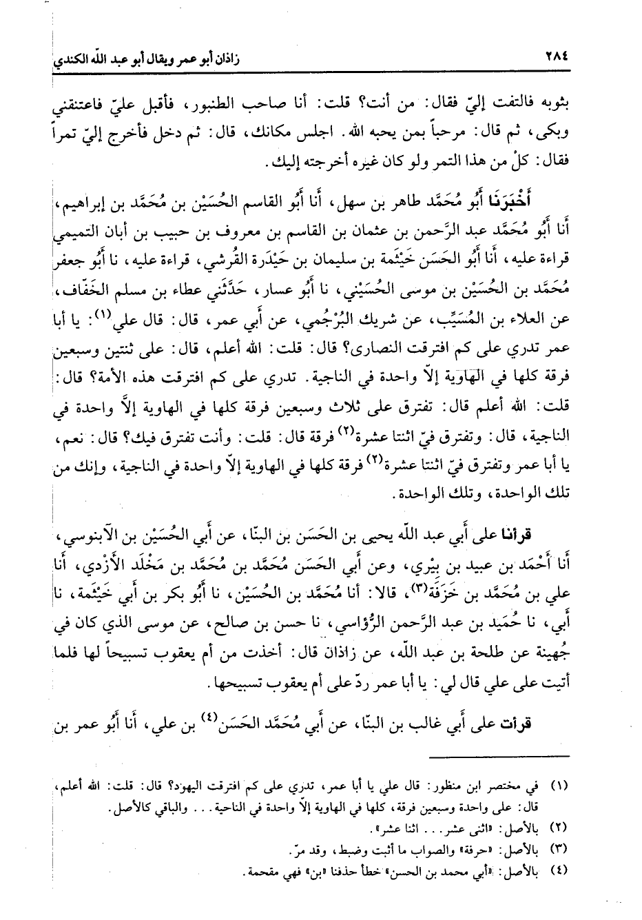 بثوبه فالتفت إلي فقال من أنت قلت أنا صاحب الطنبور فأقبل علي فاعتنقني وبكى ثم قال مرحبا بمن يحبه الله اجلس مكانك قال ثم دخل فأخرج إلي تمرا فقال كل من هذا التمر ولو كان غيره أخرجته إليك أخبرنا أبو محمد طاهر بن سهل أنا أبو القاسم الحسين بن محمد بن إبراهيم أنا أبو محمد عبد الرحمن بن عثمان بن القاسم بن معروف بن حبيب بنأبان التميمي قراءة عليه أنا أبو الحسن خيثمة بن سليمان بن حيدرة القرشي قراءة عليه نا أبو جعفر محمد بن الحسين بن موسى الحسيني نا أبو عسار حدثني عطاء بن مسلم الخفاف عن العلاء بن المسيب عن شريك البرجمي عنأبي عمر قال قال علي (1) يا أبا عمر تدري على كم افترقت النصارى قال قلت الله أعلم قال على ثنتين وسبعين فرقة كلها في الهاوية إلا واحدة في الناجية تدري على كم افترقت هذه الأمة قال قلت الله أعلم قال تفترق على ثلاث وسبعين فرقة كلها في الهاوية إلا واحدة في الناجية قال وتفترق في اثنتا عشرة (2) فرقة قال قلت وأنت تفترق فيك قال نعم يا أبا عمر وتفترق في اثنتا عشرة (2) فرقة كلها في الهاوية إلا واحدة في الناجية وإنك من تلك الواحدة تلك الواحدة قرأنا على أبي عبد الله يحيى بن الحسن بن البنا عن أبي الحسين بن الآبنوسي أنا أحمد بن عبيد بن بيري وعن أبي الحسن محمد بن محمد بن مخلد الأزدي أنا علي بن محمد بن خزفة (3) قالا أنا محمد بن الحسين نا أبو بكر بن أبي خيثمة نا أبي نا حميد بن عبد الرحمن الرؤاسي نا حسن بن صالح عن موسى الذي كان في جهينة عن طلحة بن عبد الله عن زاذان قال أخذت من أم يعقوب تسبيحا لها فلما أتيت على علي قال لي يا أبا عمر رد على أم يعقوب تسبيحها قرأت على أبي غالب بن البنا عنأبي محمد الحسن (4) بن علي أنا أبو عمر بن
