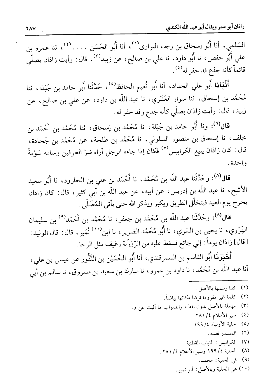 السلمي أنا أبو إسحاق بن رجاء الرارى (1) أنا أبو الحسن (2) ثنا عمرو بن علي أبو حفص نا أبو داود نا علي بن صالح عن زبيد (3) قال رأيت زاذان يصلي قائما كأنه جذع قد حفر له (4) أنبأنا أبو علي الحداد أنا أبو نعيم الحافظ (5) حدثنا أبو حامد بن جبلة ثنا محمد بن إسحاق ثنا سوار العنبري نا عبد الله بن داود عن علي بن صالح عن زبيد قال رأيت زاذان يصلي كأنه جذع وقد حفر له قال (6) ونا أبو حامد بن جبلة نا محمد بن إسحاق ثنا محمد بن أحمد بن خلف نا إسحاق بن منصور السلولي نا محمد بن طلحة عن محمد بن جحادة قال كان زاذان يبيع الكرابيس (7) فكان إذا جاءه الرجل أراه شر الطرفين وسامة سومة واحدة قال (8) وحدثنا عبد الله بن محمد نا احمد بن علي بن الجارود نا أبو سعيد الأشج نا عبد الله بن إدريس عن أبيه عن عبد الله بن أبي كثير قال كان زاذان يخرج يوم العيد فيتخلل الطريق ويكبر ويذكر الله حتى يأتي المصلى قال (8) وحدثنا عبد الله بن محمد بن جعفر نا محمد بن أحمد (9) بن سليمان الهروي نا يحيى بن السري نا أبو محمد الضرير نا ابن (10) نمير قال قال الوليد قال زاذان يوما إني جائع فسقط عليه من الروزنة رغيف مثل الرحا أخبرنا أبو القاسم بن السمرقندي أنا أبو الحسين بن النقور عن عيسى بن علي أنا عبد الله بن محمد نا داود بن عمرو نا مبارك بن سعيد بن مسروق نا سالم بن أبي