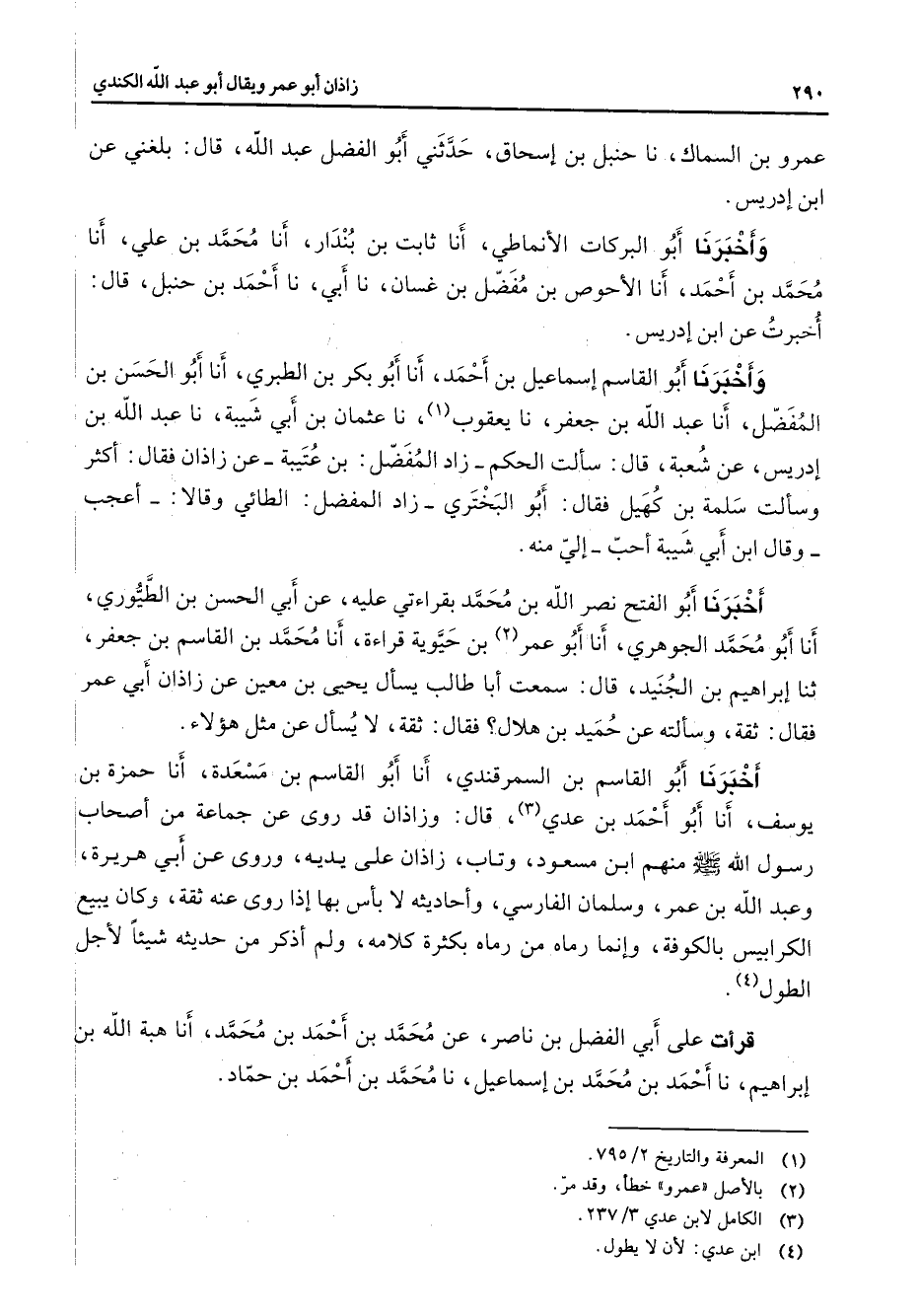 عمرو بن السماك نا حنبل بن إسحاق حدثني أبو الفضل عبد الله قال بلغني عن ابن إدريس وأخبرنا أبو البركات الأنماطي أنا ثابت بن بندار أنا محمد بن علي أنا محمد بن أحمد أنا الأحوص بن مفضل بن غسان نا أبي نا أحمد بن حنبل قال أخبرت عن ابن إدريس وأخبرنا أبو القاسم إسماعيل بن أحمد أنا أبو بكر بن الطبري أنا أبو الحسن بن المفضل أنا عبد الله بن جعفر نا يعقوب (1) نا عثمان بن أبي شيبة نا عبد الله بن إدريس عن شعبة قال سألت الحكم زاد المفضل بن عتيبة عن زاذان فقال أكثر وسألت سلمة بن كهيل فقال أبو البختري زاد المفضل الطائي وقالا أعجب وقال ابن أبي شيبة أحب إلي منه أخبرنا أبو الفتح نصر الله بن محمد بقراءتي عليه عن أبي الحسن بن الطيوري أنا أبو أحمد الجوهري أنا أبو عمر (2) بن حيوية قراءة أنا محمد بن القاسم بن جعفر ثنا إبراهيم بن الجنيد قال سمعت أبا طالب يسأل يحيى بن معين عن زاذان أبي عمر فقال ثقة وسألته عن حميد بن هلال فقال ثقة لا يسأل عن مثل هؤلاء أخبرنا أبو القاسم بن السمرقندي أنا أبو القاسم بن مسعدة أنا حمزة بن يوسف أنا أبو أحمد بن عدي (3) قال وزاذان قد روى عن جماعة من أصحاب رسول الله (صلى الله عليه وسلم) منهم ابن مسعود وتاب زاذان على يديه وروى عن أبي هريرة وعبد الله بن عمر وسلمان الفارسي وأحاديثه لا بأس بها إذا روى عنه ثقة وكان يبيع الكرابيس بالكوفة وإنما رماه من رماه بكثرة كلامه ولم أذكر من حديثه شيئا لأجل الطول (4) قرأت على أبي الفضل بن ناصر عن محمد بن أحمد بن محمد أنا هبة الله بن إبراهيم نا أحمد بن محمد بن إسماعيل نا محمد بن أحمد بن حماد