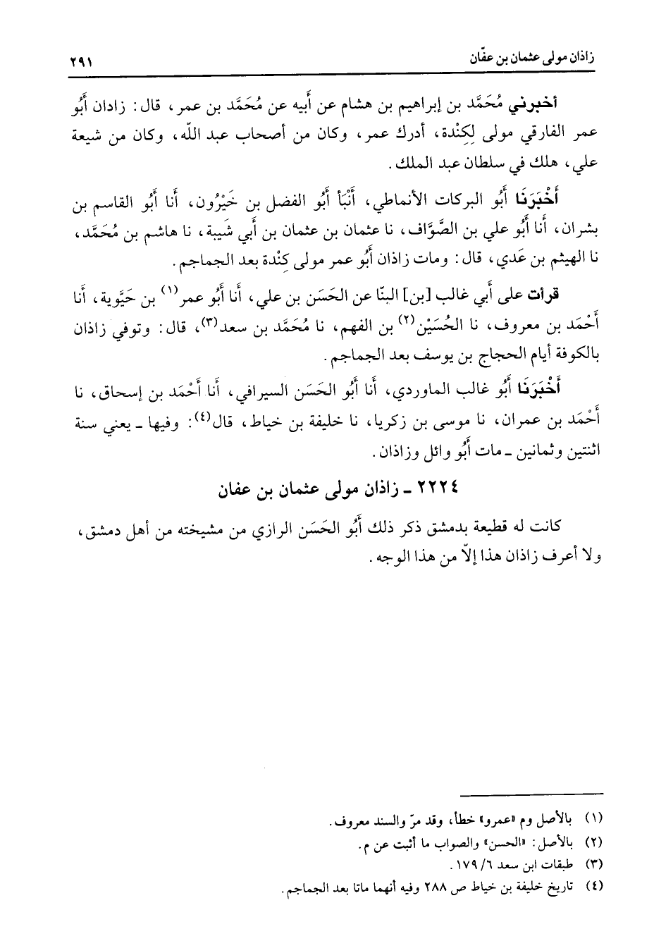 2224 - زاذان مولى عثمان بن عفان كانت له قطيعة بدمشق ذكر ذلك أبو الحسن الرازي من مشيخته من أهل دمشق ولا أعرف زاذا ن هذا إلا من هذا الوجه