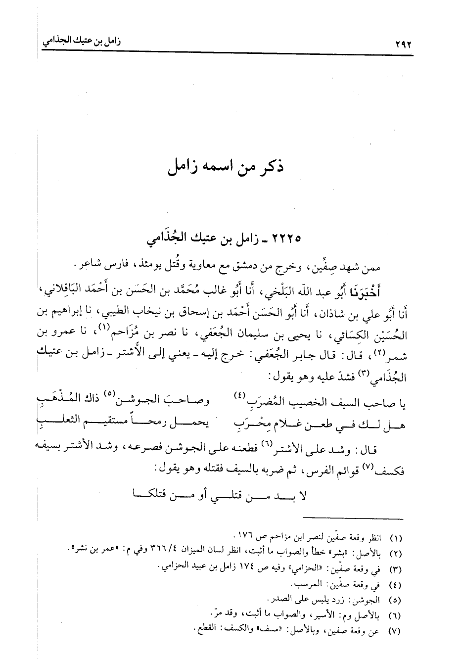 2225 - زامل بن عتيك الجذامي ممن شهد صفين وخرج من دمشق مع معاوية وقتل يومئذ فارس شاعر أخبرنا أبو عبد الله البلخي أنا أبو غالب محمد بن الحسن بنأحمد الباقلاني أنا أبو علي بن شاذان أنا أبو الحسن أحمد بن إسحاق بن نيخاب الطيبي نا إبراهيم بن الحسين الكسائي نا يحيى بن سليمان الجعفي نا نصر بن مزاحم (1) نا عمرو بن شمر (2) قال قال جابر الجعفي خرج إليه يعني إلى الأشتر زامل بن عتيك الجذامي (3) فشد عليه وهو يقول * يا صاحب الخصيب المضرب (4) * وصاحب الجوشن (5) ذاك المذهب هل لك في طعن غلام محرب * يحمل رمحا مستقيم الثعلب * قال وشد على الأشتر (6) فطعنه على الجوشن فصرعه وشد الأشتر بسيفه فكسف (7) قوائم الفرس ثم ضربه بالسيف فقتله وهو يقول * لا بد من قتلي أو من قتلكا