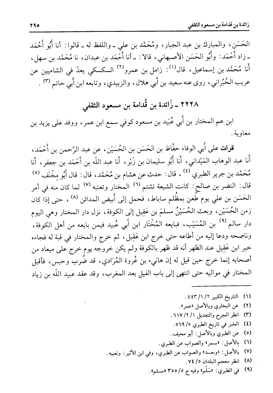 2228 - زائدة بن قدامة بن مسعود الثقفي ابن عم المختار بن أبي عبيد بن مسعود كوفي سمع ابن عمر ووفد على يزيد بن معاوية قرأت على أبي الوفاء حفاظ بن الحسن بن الحسين عن عبد الرحمن بنأحمد أنا عبد الوهاب الميداني أنا أبو سليمان بن زبر أنا عبد الله بنأحمد بن جعفر أنا محمد بن جرير الطبري (4) قال حدث عن هشام بن محمد قال قال أبو مخنف (5) قال النضر بن صالح كانت الشيعة تشتم (6) المختار وتعتبه (7) لما كان منه في أمر الحسن بن علي يوم طعن بمظلم ساباط فحمل إلى أبيض المدائن (8) حتى إذا كان زمن الحسين وبعث الحسين مسلم بن عقيل إلى الكوفة نزل دار المختار وهي اليوم دار سالم (9) بن المسيب فبايعه المختار ابن أبي عبيد فيمن بايعه من أهل الكوفة وناصحه ودعا إليه من أطاعه حتى خرج ابن عقيل ثم خرج والمختار في قبة له فجاءه خبر ابن عقيل عند الظهر أنه قد ظهر بالكوفة ولم يكن خروجه يوم خرج على ميعاد من أصحابه إنما خرج حين قيل له إن هانئ بن عروة المرادي قد ضرب وحبس فأقبل المختار في مواليه حتى انتهى إلى باب الفيل بعد المغرب وقد عقد عبيد الله بن زياد