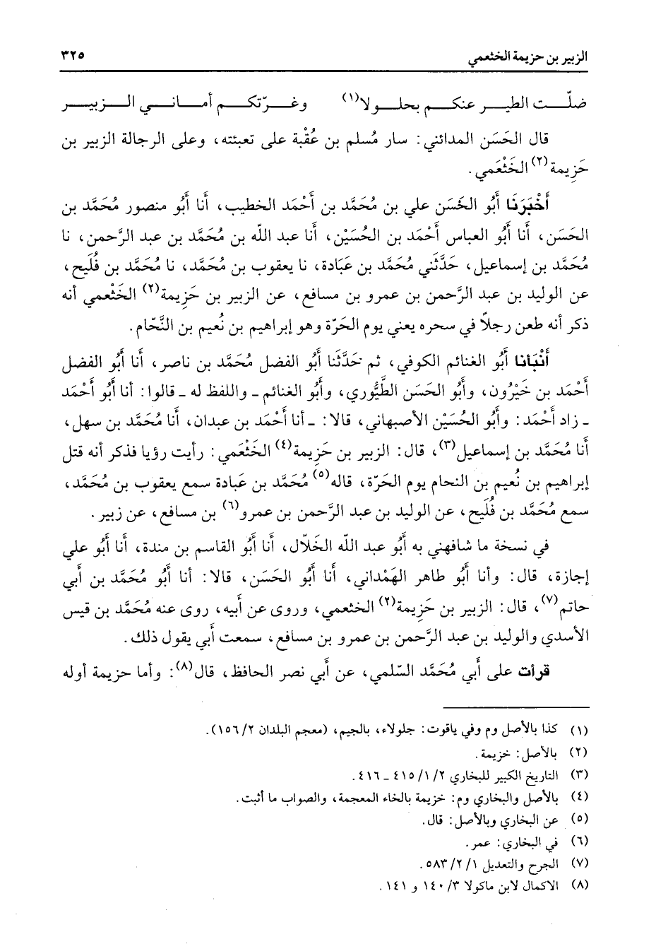 ضلت الطير عنكم بحلولا (1) * وغرتكم أماني الزبير * قال الحسن المدائني سار مسلم بن عقبة على تعبئته وعلى الرجالة الزبير بن حزيمة (2) الخثعمي أخبرنا أبو الحسن علي بن محمد بن أحمد الخطيب أنا أبو منصور محمد بن الحسن أنا أبو العباس أحمد بن الحسين أنا عبد الله بن محمد بن عبد الرحمن نا محمد بن إسماعيل حدثني محمد بن عبادة نا يعقوب بن محمد نا محمد بن فليح عن الوليد بن عبد الرحمن بن عمرو بن مسافع عن الزبير بن خزيمة (2) الخثعمي أنه ذكر أنه طعن رجلا في سحره يعني يوم الحرة وهو إبراهيم بن نعيم بن النحام أنبأنا أبو الغنائم الكوفي ثم حدثنا أبو الفضل محمد بن ناصر أنا أبو الفضل أحمد بن خيرون وأبو الحسين الطيوري وأبو الغنائم واللفظ له قالوا أنا أبو أحمد زاد أحمد وأبو الحسين الأصبهاني قالا أنا أحمد بن عبدان أنا محمد بن سهل أنا محمد بن إسماعيل (3) قال الزبير بن حزيمة (4) الخثعمي رأيت رؤيا فذكر أنه قتل إبراهيم بن نعيم بن النحام يوم الحرة قاله (5) محمد بن عبادة سمع يعقوب بن محمد سمع محمد بن فليح عن الوليد بن عبد الرحمن بن عمرو (6) بن مسافع عن زبير في نسخة ما شافهني به أبو عبد الله الخلال أنا أبو القاسم بن مندة أنا أبو علي إجازة قال وأنا أبو طاهر الهمداني أنا أبو الحسن قالا أنا أبو محمد بن أبي حاتم (7) قال الزبير بن حزيمة (2) الخثعمي وروى عنأبيه روى عنه محمد بن قيس الأسدي والوليد بن عبد الرحمن بن عمرو بن مسافع سمعت أبي يقول ذلك قرأت على أبي محمد السلمي عن أبي نصر الحافظ قال (8) وأما حزيمة أوله