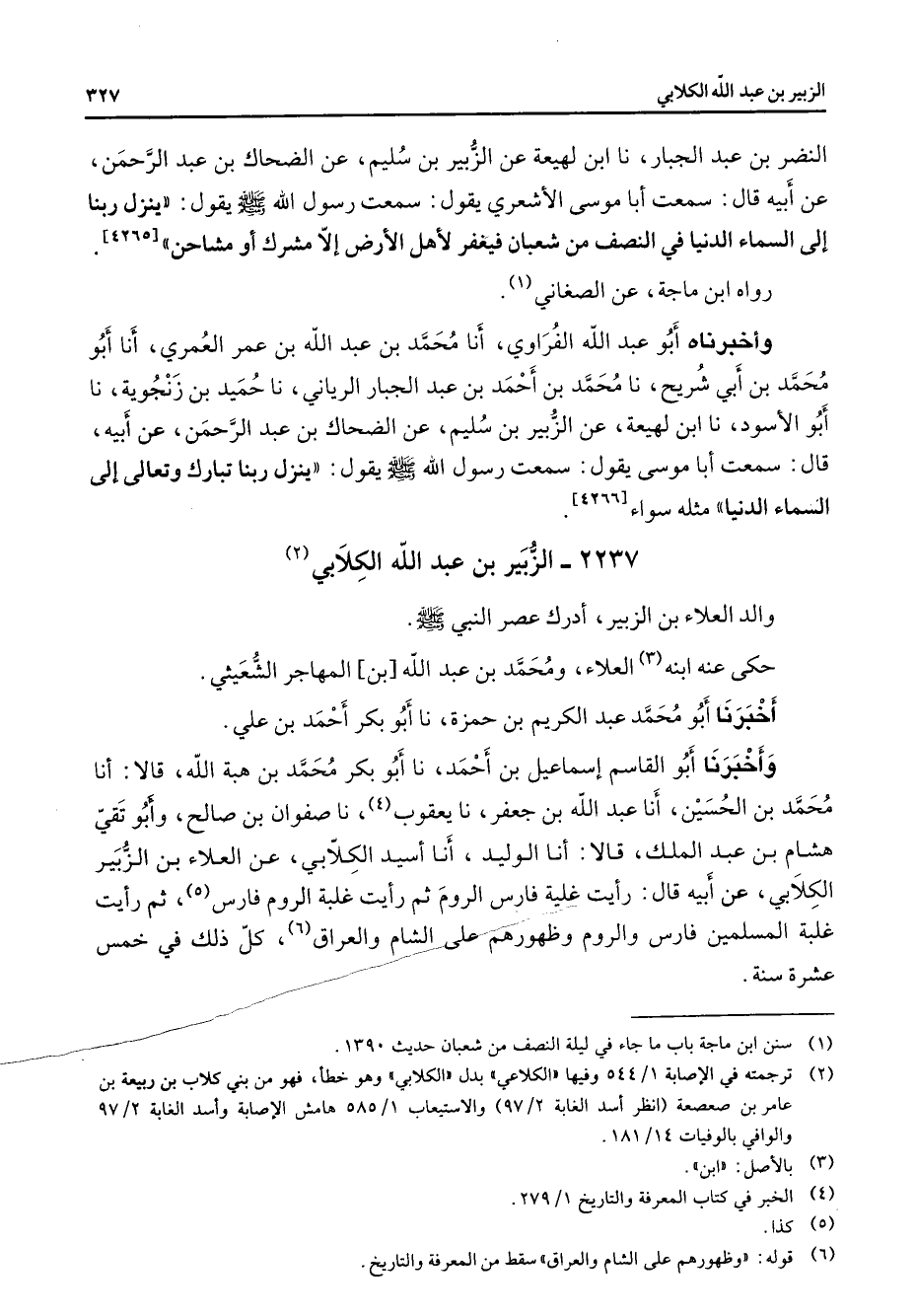 2237 - الزبير بن عبد الله الكلابي (2) والد العلاء بن الزبير أدرك عصر النبي (صلى الله عليه وسلم) حكى عنه ابنه (3) العلاء ومحمد بن عبد الله بن المهاجر الشعيثي أخبرنا أبو محمد عبد الكريم بن حمزة نا أبو بكر أحمد بن علي وأخبرنا أبو القاسم إسماعيل بن أحمد ناأو بكر محمد بن هبة الله قالا أنا محمد بن الحسين أنا عبد الله بن جعفر نا يعقوب (4) نا صفوان بن صالح وأبو تقي هشام بن عبد الملك قالا أنا الوليد أنا أسيد الكلابي عن العلاء بن الزبير الكلابي عن أبيه قال رأيت غلية فارس الروم ثم رأيت غلبة الروم وفارس (5) ثم رأيت غلبة المسلمين فارس والروم وظهورهم على الشام والعراق (6) كل ذلك في خمس عشرة سنة