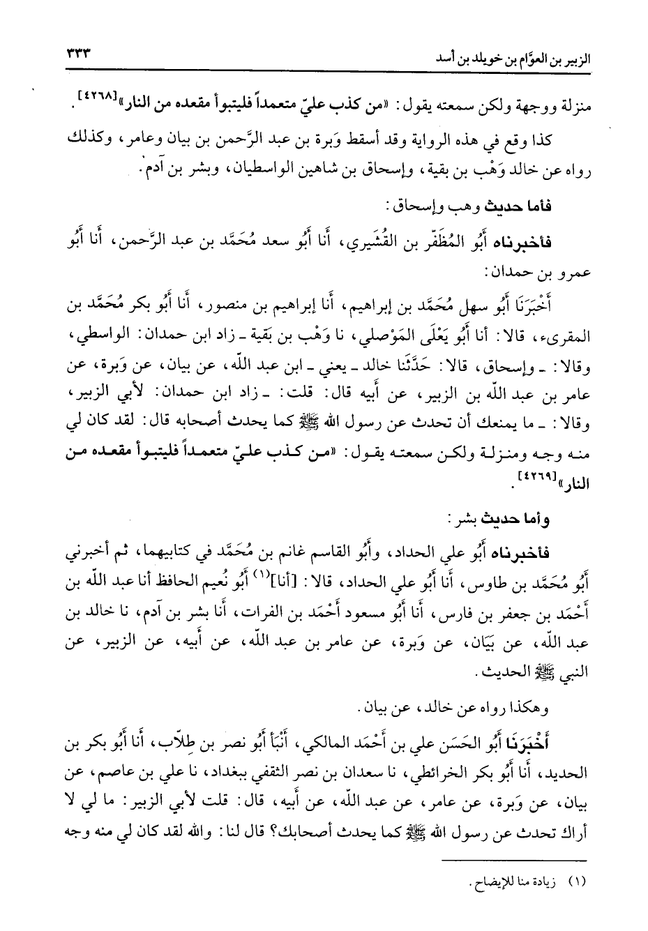 منزلة ووجهة ولكن سمعته يقول من كذب علي متعمدا فليتبوأ مقعده من النار كذا وقع في هذه الرواية وقد أسقط وبرة بن عبد الرحمن بن بيان وعامر وكذلك رواه عن خالد وهب بن بقية وإسحاق بن شاهين الواسطيان وبشر بن آدم فأما حديث وهب وإسحاق فأخبرناه أبو المظفر بن القشيري أنا أبو سعد محمد بن عبد الرحمن أنا أبو عمرو بن حمدان أخبرنا أبو سهل محمد بن إبراهيم أنا إبراهيم بن منصور أنا أبو بكر محمد بن المقرئ قالا أنا أبو يعلى الموصلي نا وهب بن بقية زاد ابن حمدان الواسطي وقالا وإسحاق قالا حدثنا خالد يعني ابن عبد الله عن بيان عن وبرة عن عامر بن عبد الله بن الزبير عن أبيه قال قلت زاد ابن حمدان لأبي الزبير وقالا ما يمنعك أن تحدث عن رسول الله (صلى الله عليه وسلم) كما يحدث أصحابه قال لقد كان لي منه وجه ومنزلة ولكن سمعته يقول من كذب علي متعمدا فليتبوأ مقعده من النار وأما حديث بشر فأخبرناه أبو علي الحداد وأبو القاسم غانم بن محمد في كتابيهما ثم أخبرني أبو محمد بن طاوس أنا أبو علي الحداد قالا أنا (1) أبو نعيم الحافظ أنا عبد الله بن أحمد بن جعفر بن فارس أنا أبو مسعود أحمد بن الفرات أنا بشر بن آدم نا خالد بن عبد الله عن بيان عن وبرة عن عامر بن عبد الله عن أبيه عن الزبير عن النبي (صلى الله عليه وسلم) الحديث وهكذا رواه عن خالد عن بيان أخبرنا أبو الحسن علي بن أحمد المالكي أنبأ أبو نصر بن طلاب أنا أبو بكر بن الحديد أنا أبو بكر الخرائطي نا سعدان بن نصر الثقفي ببغداد نا علي بن عاصم عن بيان عن وبرة عن عامر عن عبد الله عن أبيه قال قلت لأبي الزبير ما لي لا أراك تحدث عن رسول الله (صلى الله عليه وسلم) كما يحدث أصحابك قال لنا والله لقد كان لي منه وجه