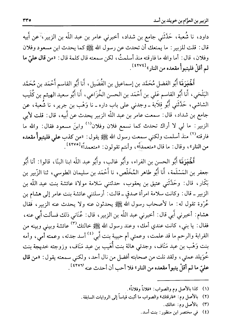 داود نا شعبة حدثني جامع بن شداد أخبرني عامر بن عبد الله بن الزبير عن أبيه قال قلت للزبير ما يمنعك أن تحدث عن رسول الله (صلى الله عليه وسلم) كما يحدث ابن مسعود وفلان وفلان قال أما والله ما فارقته منذ أسلمت لكن سمعته قال كلمة قال من قال علي ما لم أقل فليتبوأ مقعده من النار د أخبرنا أبو الفضل محمد بن إسماعيل بن الفضيل أنا أبو القاسم أحمد بن محمد البلخي أنا أبو القاسم علي بن أحمد بن الحسن الخزاعي أنا أبو سعيد الهيثم بن كليب الشاشي حدثني أبو قلابة وجدني على باب داره نا وهب بن جرير نا شعبة عن جامع بن شداد قال سمعت عامر بن عبد الله الزبير يحدث عن أبيه قال قلت لأبي الزبير ما لي لا أراك تحدث كما نسمع فلان وفلان (1) وابن مسعود فقال والله ما فارقته (2) منذ أسلمت ولكني رسول الله (صلى الله عليه وسلم) يقول من كذب علي فليتبوأ مقعده من النار وقال ما قال متعمدا وأنتم تقولون متعمدا أخبرنا أبو الحسن بن الفراء وأبو غالب وأبو عبد الله ابنا البنا قالوا أنا أبو جعفر بن المسلمة أنا أبو طاهر المخلص نا أحمد بن سليمان الطوسي ثنا الزبير بن بكار قال حدثني عتيق بن يعقوب حدثتني سلامة مولاة عائشة بنت عبد الله بن الزبير قال وكانت سلامة امرأة صدق قالت أرسلتني عائشة بنت عامر إلى هشام بن عروة تقول له ما لأصحاب رسول الله (صلى الله عليه وسلم) يحدثون عنه ولا يحدث عنه الزبير فقال هشام أخبرني أبي قال أخبرني عبد الله بن الزبير قال عناني ذلك فسألت أبي عنه فقال يا بني كانت عندي أمك وعند رسول الله (صلى الله عليه وسلم) خالتك (3) عائشة وبيني وبينه من القرابة والرحم ما قد علمت وعمتي أم حبيبة بنت أبي (4) أسد جدته وعمته أمي وأمه بنت وهب بن عبد مناف وزوجته خديجة بنت خويلد عمتي ولقد نلت من صحابته أفضل من نال أحد ولكني سمعته يقول من قال علي ما لم أقل يتبوأ مقعده من النار فلا أحب أن أحدث عنه