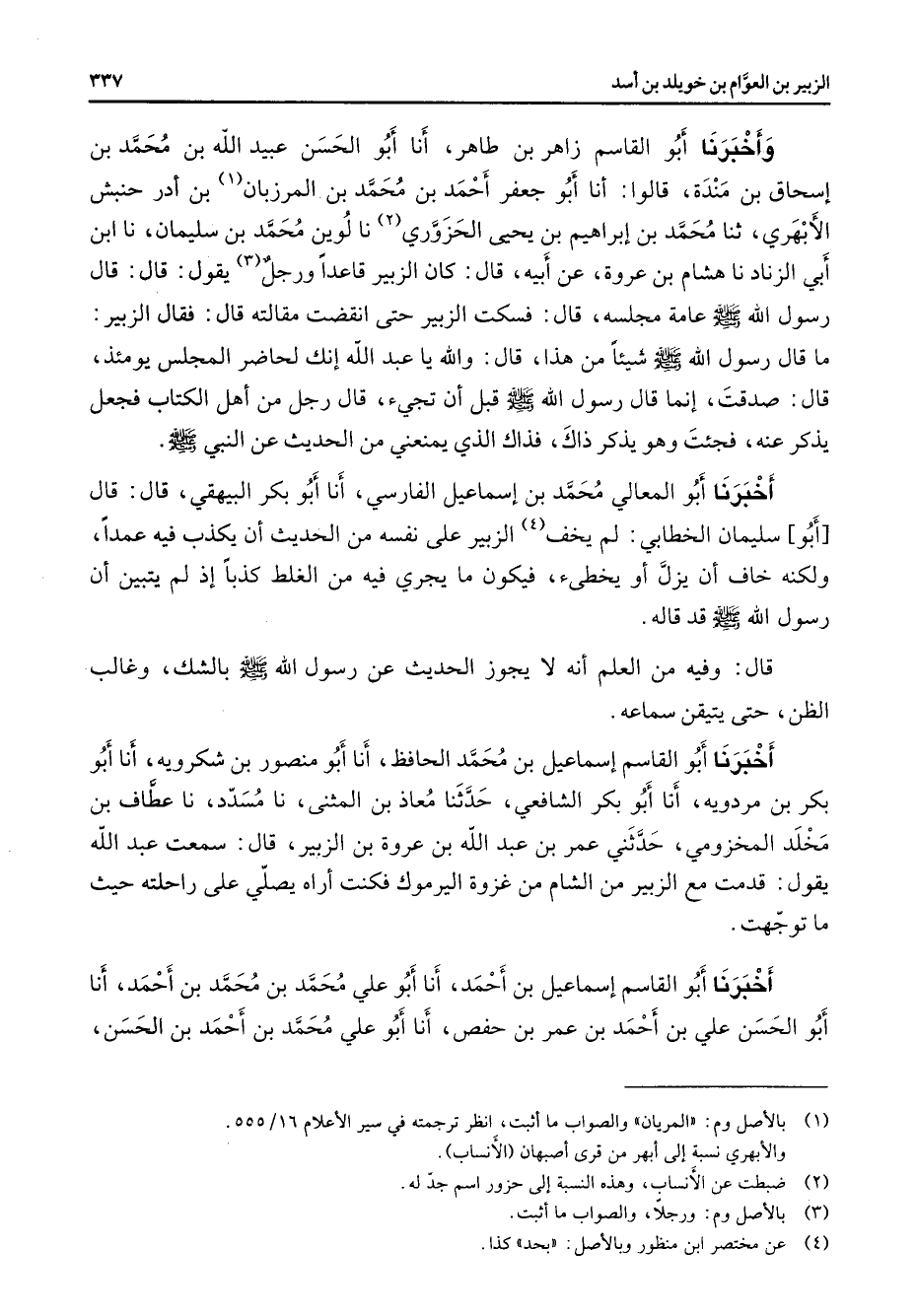وأخبرنا أبو القاسم زاهر بن طاهر أنا أبو الحسن عبيد الله بن محمد بن إسحاق بن مندة قالوا أنا أبو جعفر أحمد بن محمد بن المرزبان (1) بن أدر حنبش الأبهري ثنا محمد بن إبراهيم بن يحيى الحزوري (2) نا لوين محمد بن سليمان نا ابن أبي الزناد نا هشام بن عروة عن أبيه قال كان الزبير قاعدا ورجل يقول قال قال رسول الله (صلى الله عليه وسلم) عامة مجلسة قال فسكت الزبير حتى انقضت مقالته قال فقال الزبير ما قال رسول الله (صلى الله عليه وسلم) شيئا من هذا قال والله يا عبد الله إنك لحاضر المجلس يومئذ قال صدقت إنما قال رسول الله (صلى الله عليه وسلم) قبل أن تجئ قال رجل من أهل الكتاب فجعل يذكر عنه فجئت وهو يذكر ذاك فذاك الذي يمنعني من الحديث عن النبي (صلى الله عليه وسلم) أخبرنا أبو المعالي محمد بن إسماعيل الفارسي أنا أبو بكر البيهقي قال قال أبو سليمان الخطابي لم يخف (4) الزبير على نفسه من الحديث أن يكذب فيه عمدا ولكنه خاف أن يزل أو يخطئ فيكون ما يجري فيه من الغلط كذبا إذ لم يتبين أن رسول الله (صلى الله عليه وسلم) قد قاله