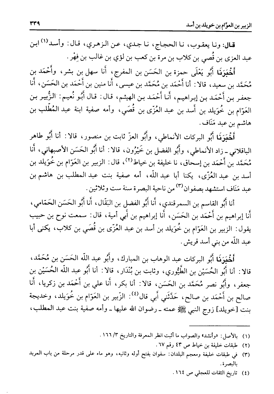 قال ونا يعقوب نا الحجاج نا جدي عن الزهري قال وأسد (1) ابن عبد العزى بن قصي بن كلاب بن مرة بن كعب بن لؤي بن غالب بن فهر أخبرنا أبو يعلى حمزة بن الحسن بن المفرج أنا سهل بن بشر وأحمد بن محمد بن سعيد قالا أنا أحمد بن محمد بن عيسى أنا منين بن أحمد بن الحسن أنا جعفر بن أحمد بن إبراهيم أنا أحمد بن الهيثم قال قال أبو نعيم الزبير بن العوام بن خويلد بنأسد بن عبد العزى بن قصي وأمه صفية ابنة عبد المطلب بن هاشم بن عبد مناف أخبرنا أبو البركات الأنماطي وأبو العز ثابت بن منصور قالا أنا أبو طاهر الباقلاني زاد الأنماطي وأبو الفضل بن خيرون قالا أنا أبو الحسن الأصبهاني أنا محمد بن أحمد بن إسحاق نا خليفة بن خياط (2) قال الزبير بن العوام بن خويلد بن أسد بن عبد العزى يكنا أبا عبد الله أمه صفية بنت عبد المطلب بن هاشم بن عبد مناف استشهد بصفوان (3) من ناحية البصرة سنة ست وثلاثين أنا أبو القاسم بن السمرقندي أنا أبو الفضل بن البقال أنا أبو الحسن الحمامي أنا إبراهيم بن أحمد بن الحسن أنا إبراهيم بن أبي أمية قالب سمعت نوح بن حبيب يقول الزبير بن العوام بن خويلد بن أسد بن عبد العزى بن قصي بن كلاب يكنى أبا عبد الله من بني أسد قريش أخبرنا أبو البركات عبد الوهاب بن المبارك وأبو عبد الله الحسن بن محمد قالا أنا أبو الحسين بن الطيوري وثابت بن بندار قالا أنا أبو عبد الله الحسين بن جعفر وأبو نصر محمد بن الحسن قالا أنا بكر أنا علي بن أحمد بن زكريا أنا صالح بن أحمد بن صالح حدثني أبي قال (4) الزبير بن العوام بن خويلد وخديجة بنت خويلد زوج النبي (صلى الله عليه وسلم) وعمته رضوان الله عليها وأمه صفية صفية بنت عبد المطلب