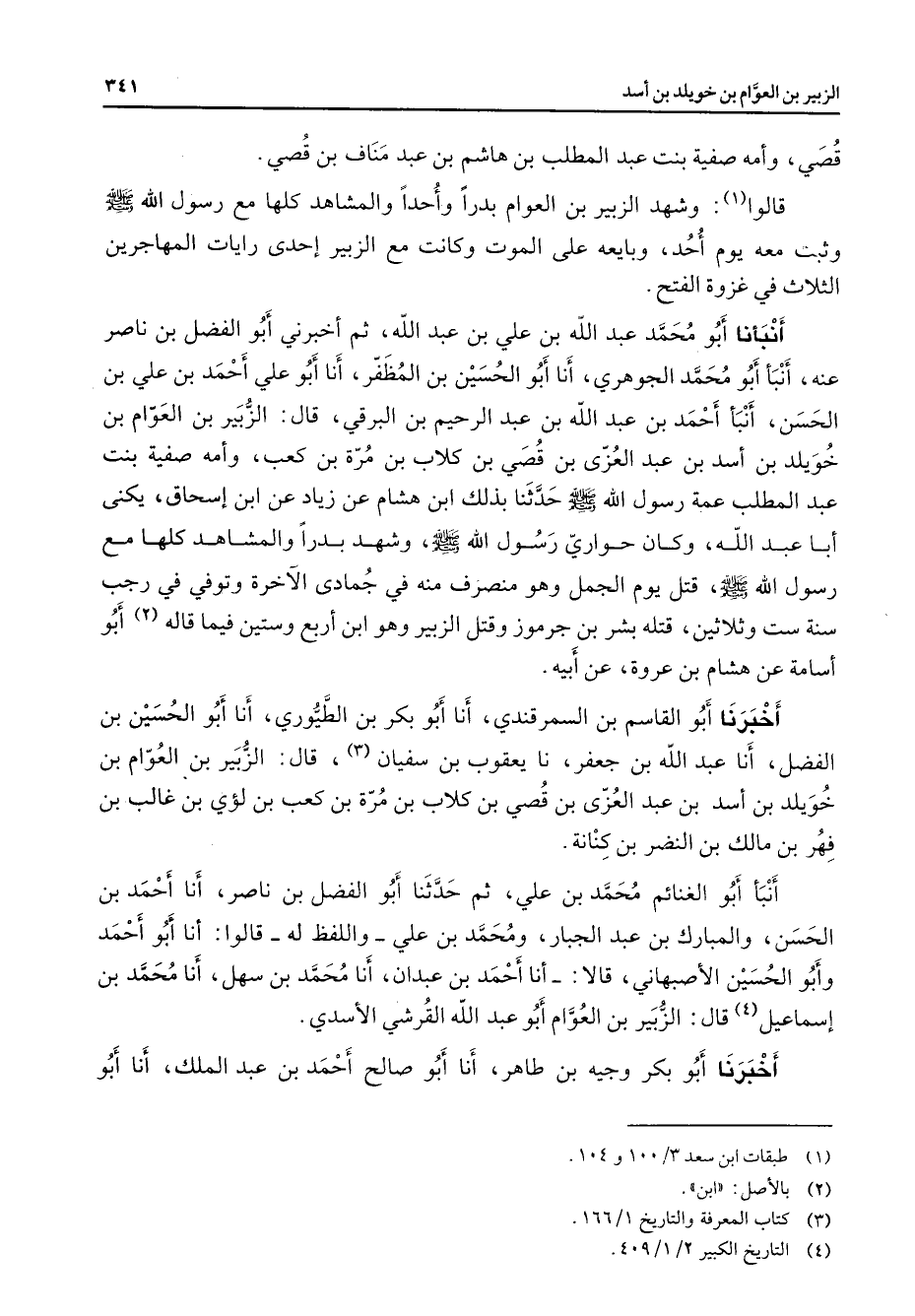 قصي وأمه صفية بنت عبد المطلب بن هاشم بن عبد مناف بن قصي قالوا (1) وشهد الزبير بن العوام بدرا وأحدا والمشاهد كلها مع رسول الله (صلى الله عليه وسلم) وثبت معه يوم أحد وبايعه على الموت وكانت مع الزبير إحدى رايات المهاجرين الثلاث في غزوة الفتح أنبأنا أبو محمد عبد الله بن علي بن عبد الله ثم أخبرني أبو الفضل بن ناصر عنه أنبأ أبو محمد الجوهري أنا أبو الحسين بن المظفر أنا أبو علي أحمد بن علي بن الحسن أنبأ أحمد بن عبد الله بن عبد الرحيم بن البرقي قال الزبير بن العوام بن خويلد بن أسد بن عبد العزى بن قصي بن كلاب بن مرة بن كعب وأمه صفية بنت عبد المطلب عمة رسول الله (صلى الله عليه وسلم) حدثنا بذلك ابن هشام عن زياد عن ابن إسحاق يكنى أبا عبد الله وكان حواري رسول الله (صلى الله عليه وسلم) وشهد بدرا والمشاهد كلها مع رسول الله قتل يوم الجمل وهو منصرف منه في جمادى الآخرة وتوفي في رجب سنة ست وثلاثين قتله بشر بن جرموز وقتل الزبير وهو ابن أربع وستين فيما قاله (2) أبو أسامة عن هشام بن عروة عن أبيه أخبرنا أبو القاسم بن السمرقندي أنا أبو بكر بن الطيوري أنا أبو الحسين بن الفضل أنا عبد الله بن جعفر نا يعقوب بن سفيان (3) قال الزبير بن العوام بن خويلد بن أسد بن عبد العزى بن قصي بن كلاب بن مرة بن كعب بن لؤي بن غالب بن فهر بن مالك بن النضر بن كنانة أنبأ أبو الغنائم محمد بن علي ثم حدثنا أبو الفضل بن ناصر أنا أحمد بن الحسن والمبارك بن عبد الجبار ومحمد بن علي واللفظ له قالوا أنا أبو أحمد وأبو الحسين الأصبهاني قالا أنا أحمد بن عبدان أنا محمد بن سهل أنا محمد بن إسماعيل (4) قال الزبير بن العوام أبو عبد الله القرشي الأسدي أخبرنا أبو بكر وجيه بن طاهر أنا أبو صالح أحمد بن عبد الملك أنا أبو