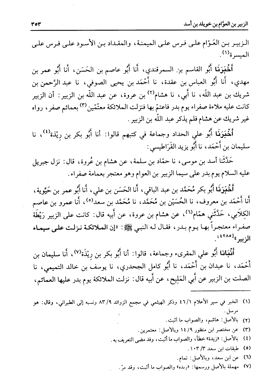 الزبير بن العوام على فرس على الميمنة والمقداد بن الأسود على فرس (1) على الميسرة أخبرنا أبو القاسم بن السمرقندي أنا أبو عاصم بن الحسن أنا أبو عمر بن مهدي أنا أبو العباس بن عقدة نا أحمد بن يحيى الصوفي نا عبد الرحمن بن شريك بن عبد الله نا أبي نا هشام (2) بن عروة عن عبد الله بن الزبير أن الزبير كانت عليه ملاءة صفراء يوم بدر فاعتم بها فنزلت الملائكة معتمين (3) بعمائم صفر رواه غير شريك عن هشام فلم يذكر عبد الله بن الزبير أخبرنا أبو علي الحداد وجماعة في كتبهم قالوا أنا أبو بكر بن ريذة (4) نا سليمان بن أحمد نا أبو يزيد القراطيسي حدثنا أسد بن موسى نا حماد بن سلمة عن هشام بن عروة قال نزل جبريل عليه السلام يوم بدر على سيما الزبير بن العوام وهو معتجر بعمامة صفراء أخبرنا أبو بكر محمد بن عبد الباقي أنا الحسن بن علي أنا أبو عمر بن حيوية أنا أحمد بن معروف نا الحسين بن محمد نا محمد بن سعد (5) أنا عمرو بن عاصم الكلابي حدثني همام (6) عن هشام بن عروة عنأبيه قال كانت على الزبير ريطة صفراء معتجرا بها يوم بدر فقال له النبي (صلى الله عليه وسلم) إن الملائكة نزلت على سيماء الزبير أنبأنا أبو علي المقرئ وجماعة قالوا أنا أبو بكر بن ريذة (7) أنا سليمان بن أحمد نا عبدان بن أحمد نا أبو كامل الجحدري نا يوسف بن خالد التميمي نا الصلت بن الزبير عن أبي المليح عن أبيه قال نزلت الملائكة يوم بدر عليها العمائم