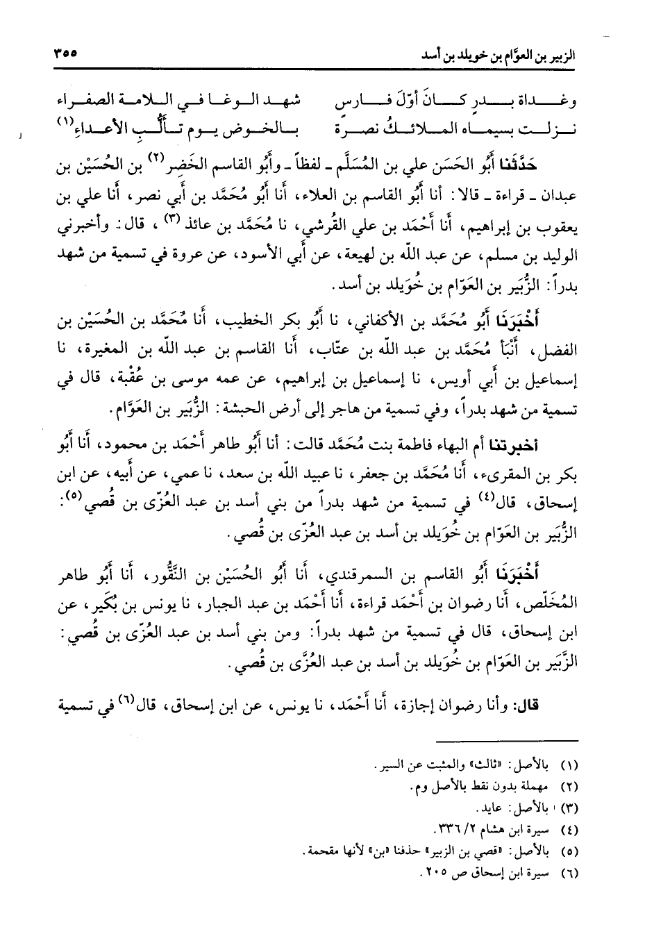 وغداة بدر كان أول فارس * شهد الوغا في اللامة الصفراء نزلت بسيماه الملائك نصرة * بالخوض يوم تألب الأعداء * (1) حدثنا أبو الحسن علي بن المسلم لفظا وأبو القاسم الخضر (2) بن الحسين بن عبدان قراءة قالا أنا أبو القاسم بن العلاء أنا أبو محمد بن أبي نصر أنا علي بن يعقوب بن إبراهيم أنا أحمد بن علي القرشي نا محمد بن عائذ (3) قال وأخبرني الوليد بن مسلم عن عبد الله بن لهيعة عن أبي الأسود عن عروة في تسمية من شهد بدرا الزبير بن العوام بن خويلد بن أسد أخبرنا أبو محمد بن الأكفاني نا أبو بكر الخطيب أنا محمد بن الحسين بن الفضل أنبأ محمد بن عبد الله بن عتاب أنا القاسم بن عبد الله بن المغيرة نا إسماعيل بن أبي أويس نا إسماعيل بن إبراهيم عن عمه موسى بن عقبة قال في تسمية من شهد بدرا وفي تسمية من هاجر إلى أرض الحبشة الزبير بن العوام أخبرتنا أم البهاء فاطمة بنت محمد قالت أنا أبو طاهر أحمد بن محمود أنا أبو بكر بن المقرئ أنا محمد بن جعفر نا عبيد بن سعد نا عمي عن أبيه عن ابن إسحاق قال (4) في تسمية من شهد بدرا من بني أسد بن عبد العزى بن قصي (5) الزبير بن العوام بن خويلد بن أسد بن عبد العزى بن قصي أخبرنا أبو القاسم بن السمرقندي أنا أبو الحسين بن النقور أنا أبو طاهر المخلص أنا رضوان بن أحمد قراءة أنا أحمد بن عبد الجبار نا يونس بن بكير عن ابن إسحاق قال في تسمية من شهد بدرا ومن بني أسد بن عبد العزى بن قصي الزبير بن العوام بن خويلد بن أسد بن عبد العزى بن قصي قال وأنا رضوان إجازة أنا أحمد نا يونس عن ابن إسحاق قال (6) في تسمية