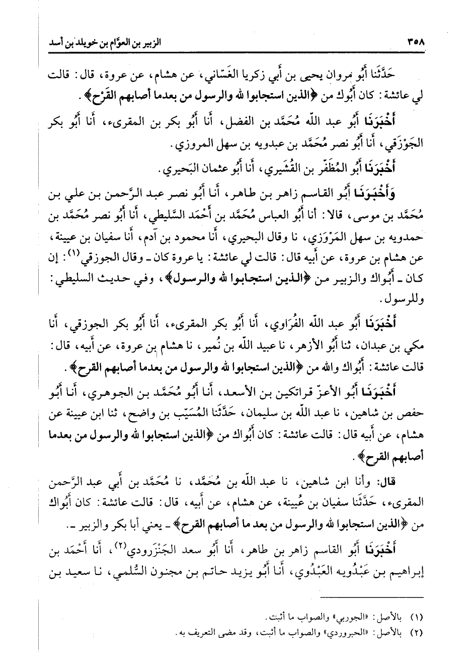 حدثنا أبو مروان يحيى بن أبي زكريا الغساني عن هشام عن عروة قال قالت لي عائشة كان أبوك من " الذين استجابوا لله والرسول من بعد ما أصابهم القرح " أخبرنا أبو عبد الله محمد بن الفضل أنا أبو بكر بن المقرئ أنا أبو بكر الجوزقي أنا أبو نصر محمد بن عبدويه بن سهل المروزي أخبرنا أبو المظفر بن القشيري أنا أبو عثمان البحيري وأخبرنا أبو القاسم زاهر بن طاهر أنا أبو نصر عبد الرحمن بن علي بن محمد بن موسى قالا أنا أبو العباس محمد بن أحمد السليطي أنا أبو نصر محمد بن حمدويه بن سهل المروزي نا وقال البحيري أنا محمود بن آدم أنا سفيان بن عيينة عن هشام بن عروة عنأبيه قال قالت لي عائشة يا عروة كان وقال الجوزقي (1) إن كان أبواك والزبير من " الذين استجابوا لله والرسول " وفي حديث السليطي وللرسول أخبرنا أبو عبد الله الفراوي أنا أبو بكر المقرئ أنا أبو بكر الجوزقي أنا مكي بن عبدان ثنا أبو الأزهر نا عبيد بن نمير نا هشام بن عروة عنأبيه قال قالت عائشة أبواك والله من " الذين استجابوا لله والرسول من بعد ما أصابهم القرح " أخبرنا أبو الأعز قراتكين بن الأسعد أنا أبو محمد بن الجوهري أنا أبو حفص بن شاهين نا عبد الله بن سليمان حدثنا المسيب بن واضح ثنا ابن عيينة عن هشام عن أبيه قال قالت عائشة كان أبواك من " الذين استجابوا لله والرسول من بعد ما أصابهم القرح " قال وأنا ابن شاهين نا عبد الله بن محمد نا محمد بن أبي عبد الرحمن المقرئ حدثنا سفيان بن عيينة عن هشام عن أبيه قال قالت عائشة كان أبواك من " الذين استجابوا لله والرسول من بعد ما أصابهم القرح " يعني أبا بكر والزبير أخبرنا أبو القاسم زاهر بن طاهر أنا أبو سعد الجنزرودي (2) أنا أحمد بن إبراهيم بن عبدويه أنا أبو يزيد حاتم بن مجنون السلمي نا سعيد بن