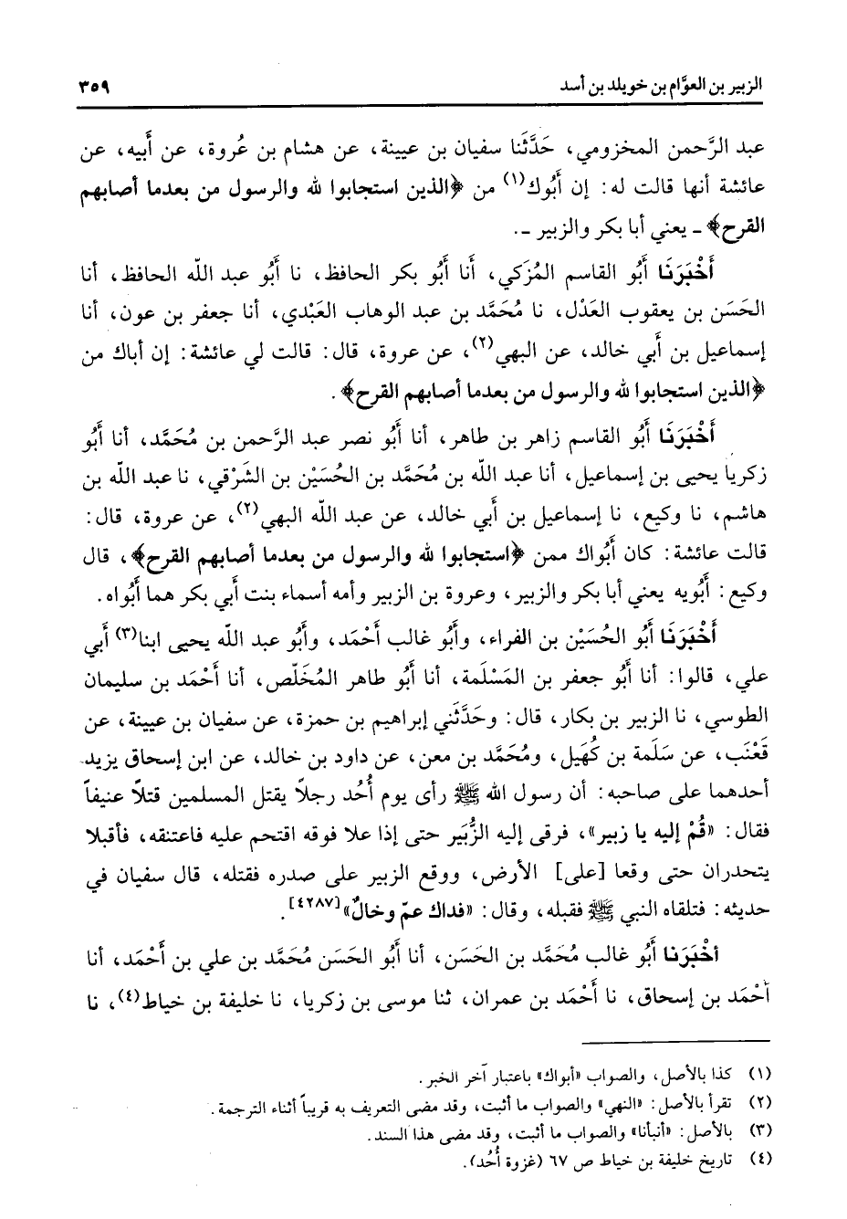 عبد الرحمن المخزومي حدثنا سفيان بن عيينة عن هشام بن عروة عن أبيه عن عائشة أنها قالت له إن أبوك (1) من " الذين استجابوا لله والرسول من بعد ما أصابهم القرح " يعني أبا بكر والزبير أخبرنا أبو القاسم المزكي أنا أبو بكر الحافظ نا أبو عبد الله الحافظ أنا الحسن بن يعقوب العدل نا محمد بن عبد الوهاب العبدي أنا جعفر بن عون أنا إسماعيل بن أبي خالد عن البهي (2) عن عروة قال قالت لي عائشة إن أباك من الذين استجابوا لله والرسول من بعد ما أصابهم القرح " أخبرنا أبو القاسم زاهر بن طاهر أنا أبو نصر عبد الرحمن بن محمد أنا أبو زكريا يحيى بن إسماعيل أنا عبد الله بن محمد بن الحسين بن الشرقي نا عبد الله بن هاشم نا وكيع نا إسماعيل بن أبي خالد عن عبد الله البهي (2) عن عروة قال قالت عائشة كان أبواك ممن " استجابوا لله والرسول من بعد ما أصابهم القرح " قال وكيع أبويه يعني أبا بكر والزبير وعروة بن الزبير وأمه أسماء بنت أبي بكر هما أبواه أخبرنا أبو الحسين بن الفراء وأبو غالب أحمد وأبو عبد الله يحيى ابنا (3) أبي علي قالوا أنا جعفر بن المسلمة أنا أبو طاهر المخلص أنا أحمد بن سليمان الطوسي نا الزبير بن بكار قال وحدثني إبراهيم بن حمزة عن سفيان بن عيينة عن قعنب عن سلمة بن كهيل ومحمد بن معن عن داود بن خالد عن ابن إسحاق يزيد أحدهما على صاحبه أن سول الله (صلى الله عليه وسلم) رأى يوم أحد رجلا يقتل المسلمين قتلا عنيفا فقال قم إليه يا زبير فرقى إليه الزبير حتى إذا علا فوقه اقتحم عليه فاعتنقه فأقبلا يتحدران حتى وقعا على الأرض ووقع الزبير على صدره فقتله قال سفيان في حديثه فتلقاه النبي (صلى الله عليه وسلم) فقبله وقال فذاك عم وخال أخبرنا أبو غالب محمد بن الحسن أنا أبو الحسن محمد بن علي بن أحمد أنا أحمد بن إسحاق نا أحمد بن عمران ثنا موسى بن زكريا نا خليفة بن خياط (4) نا