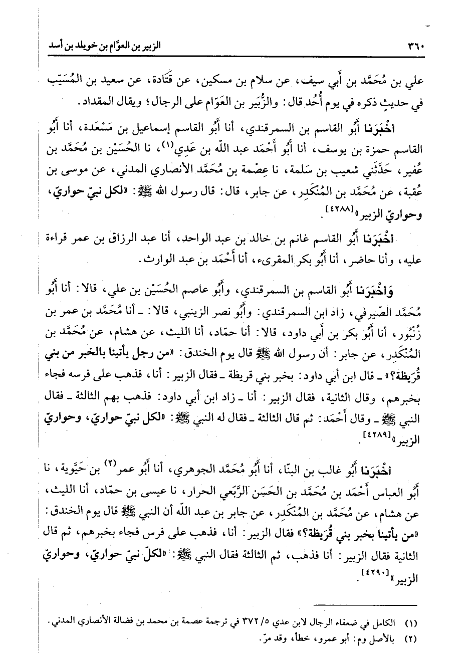 علي بن محمد بن أبي سيف عن سلام بن مسكين عن قتادة عن سعيد بن المسيب في حديث ذكره في يوم أحد قال والزبير بن العوام على الرجال ويقال المقداد أخبرنا أبو القاسم بن السمرقندي أنا أبو القاسم إسماعيل بن مسعدة أنا أبو القاسم حمزة بن يوسف أنا أبو أحمد عبد الله بن عدي (1) نا الحسين بن محمد بن عفير حدثني شعيب بن سلمة نا عصمة بن محمد الأنصاري المدني عن موسى بن عقبة عن محمد بن المنكدر عن جابر قال قال رسول الله ص لكل نبي حواري وحواري الزبير أخبرنا أبو القاسم غانم بن خالد بن عبد الواحد أنا عبد الرزاق بن عمر قراءة عليه وأنا حاضر أنا أبو بكر المقرئ أنا أحمد بن عبد الوارث وأخبرنا أبو القاسم بن السمرقندي وأبو عاصم الحسين بن علي قالا أنا أبو محمد الصيرفي زاد ابن السمرقندي وأبو نصر الزينبي قالا أنا محمد بن عمر بن زنبور أنا أبو بكر بن أبي داود قالا أنا حماد أنا الليث عن هشام عن محمد بن المنكدر عن جابر أن رسول الله (صلى الله عليه وسلم) قال يوم الخندق من رجل يأتينا بالخبر من بني قريظة قال ابن أبي داود بخبر بني قريظة فقال الزبير أنا فذهب على فرسه فجاء بخبرهم وقال الثانية فقال الزبير أنا زاد ابن أبي داود فذهب بهم الثالثة فقال النبي ص وقال أحمد ثم قال الثالثة فقال له النبي (صلى الله عليه وسلم) لكل نبي حواري وحواري الزبير أخبرنا أبو غالب بن البنا أنا أبو محمد الجوهري أنا أبو عمر (2) بن حيوية نا أبو العباس أحمد بن محمد بن الحسين الربعي الحرار نا عيسى بن حماد أنا الليث عن هشام عن محمد بن المنكدر عن جابر بن عبد الله أن النبي ص قال يوم الخندق من يأتينا بخبر بني قريظة فقال الزبير أنا فذهب على فرس فجاء بخبرهم ثم قال الثانية فقال الزبير أنا فذهب ثم الثالة فقال النبي ص لكل نبي حواري وحواري الزبير
