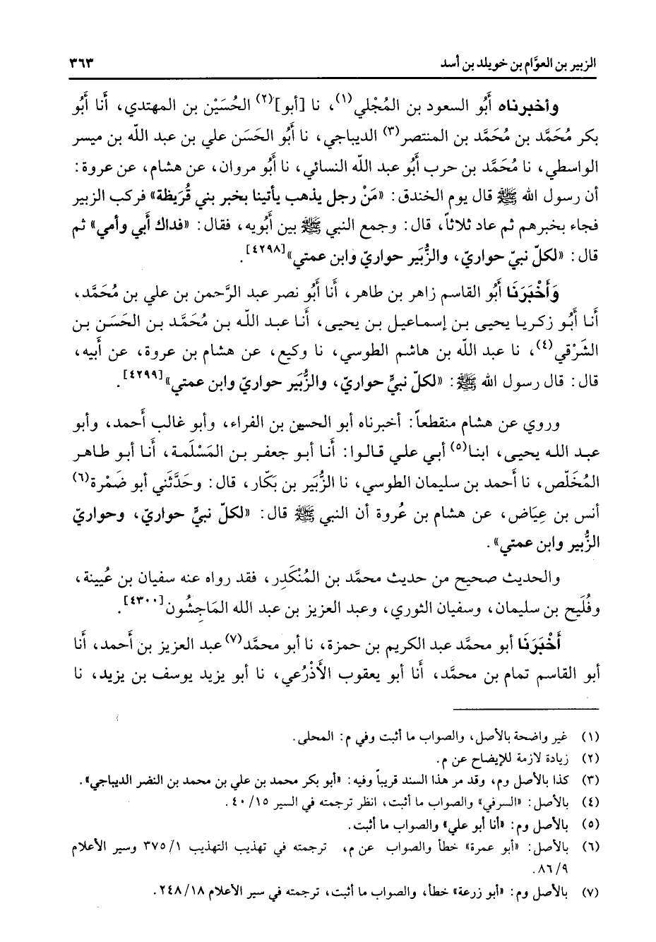 وأخبرناه أبو السعود بن المجلي (1) نا أبو (2) الحسين بن المهتدي أنا أبو بكر محمد بن محمد بن المنتصر (3) الديباجي نا أبو الحسن علي بن عبد الله بن ميسر الواسطي نا محمد بن حرب أبو عبد الله النسائي نا أبو مروان عن هشام عن عروة أن رسول الله (صلى الله عليه وسلم) قال يوم الخندق من رجل يذهب يأتينا بخبر بني قريظة فركب الزبير فجاء بخبرهم ثم عاد ثلاثا قال وجمع النبي (صلى الله عليه وسلم) بين أبويه فقال فذاك أبي وأمي ثم قال لكل نبي حواري والزبير حواري وابن عمتي وأخبرنا أبو القاسم زاهر بن طاهر أنا أبو نصر عبد الرحمن بن علي بن محمد أنا أبو زكريا يحيى بن إسماعيل بن يحيى أنا عبد الله بن محمد بن الحسن بن الشرقي (4) نا عبد الله بن هاشم الطوسي نا وكيع عن هشام بن عروة عن أبيه قال قال رسول الله (صلى الله عليه وسلم) لكل نبي حواري والزبير حواري وابن عمتي وروي عن هشام منقطعا أخبرناه أبو الحسين بن الفراء وأبو غالب أحمد وأبو عبد الله يحيى (5) ابنا أبي علي قالوا أنا أبو جعفر بن المسلمة أنا أبو طاهر المخلص نا أحمد بن سليمان الطوسي نا الزبير بن بكار قال وحدثني أبو ضمرة (6) أنس بن عياض عن هشام بن عروة أن النبي (صلى الله عليه وسلم) قال لكل نبي حواري وحواري الزبير وابن عمتي والحديث صحيح من حديث محمد بن المنكدر فقد رواه عنه سفيان بن عيينة وفليح بن سليمان وسفيان الثوري وعبد العزيز بن عبد الله الماجشون أخبرنا أبو محمد عبد الكريم بن حمزة نا أبو محمد (7) عبد العزيز بنأحمد أنا أبو القاسم تمام بن محمد أنا أبو يعقوب الأذرعي نا أبو يزيد يوسف بن يزيد نا