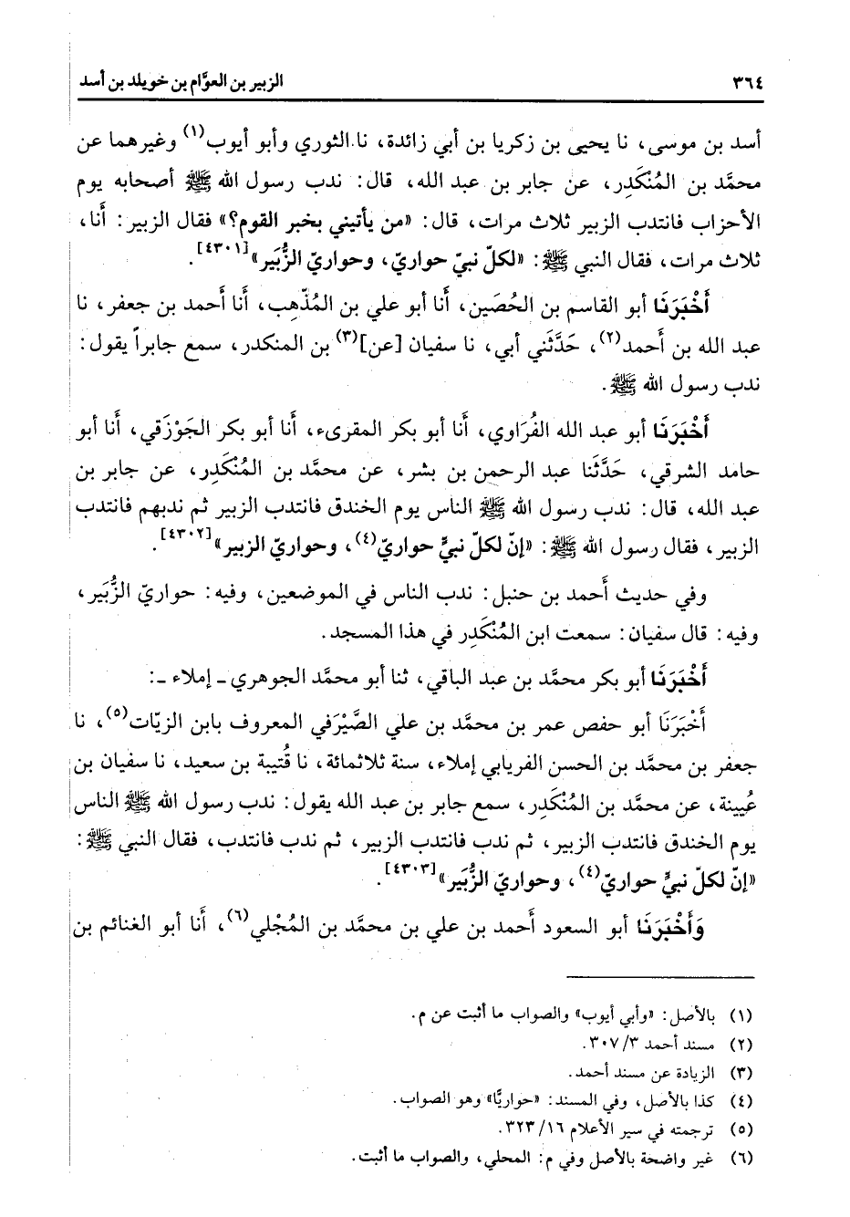أسد بن موسى نا يحيى بن زكريا بنأبي زائدة نا الثوري وأبو أيوب (1) وغيرهما عن محمد بن المنكدر عن جابر بن عبد الله قال ندب رسول الله (صلى الله عليه وسلم) أصحابه يوم الأحزاب فانتدب الزبير ثلاث مرات قال من يأتيني بخبر القوم فقال الزبير أنا ثلاث مرات فقال النبي (صلى الله عليه وسلم) لكل نبي حواري وحواري الزبير أخبرنا أبو القاسم بن الحصين أنا أبو علي بن المذهب أنا أحمد بن جعفر نا عبد الله بن أحمد (2) حدثني أبي نا سفيان عن (3) بن المنكدر سمع جابرا يقول ندب رسول الله (صلى الله عليه وسلم) أخبرنا أبو عبد الله الفراوي أنا أبو بكر المقرئ أنا أبو بكر الجوزقي أنا أبو حامد الشرقي حدثنا عبد الرحمن بن بشر عن محمد بن المنكدر عن جابر بن عبد الله قال ندب رسول الله (صلى الله عليه وسلم) الناس يوم الخندق فانتدب الزبير ثم ندبهم فانتدب الزبير فقال رسول الله (صلى الله عليه وسلم) إن لكل نبي حواري (4) وحواري الزبير وفي حديث أحمد بن حنبل ندب الناس في الموضعين وفيه حواري الزبير وفيه قال سفيان سمعت ابن المنكدر في هذا المسجد أخبرنا أبو بكر محمد بن عبد الباقي ثنا أبو محمد الجوهري إملاء أخبرنا أبو حفص عمر بن محمد بن علي الصيرفي المعروف بابن الزيات (5) نا جعفر بن محمد بن الحسن الفريابي إملاء سنة ثلاثمائة نا قتيبة بن سعد نا سفيان بن عيينة عن محمد بن المنكدر سمع جابر بن عبد الله يقول ندب رسول الله ص الناس يوم الخندق فانتدب الزبير ثم ندب قانتدب الزبير ثم ندب فانتدب فقال النبي (صلى الله عليه وسلم) إن لكل نبي حواري (4) وحواري الزبير وأخبرنا أبو السعود أحمد بن علي بن محمد بن المجلي (6) أنا أبو الغنائم بن