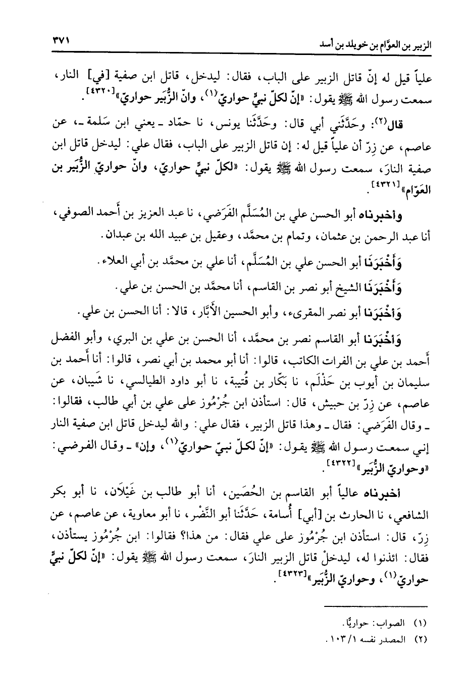 عليا قيل له إن قاتل الزبير على الباب فقال ليدخل قاتل ابن صفية في النار سمعت رسول الله (صلى الله عليه وسلم) يقول إن لكل نبي حواري (1) وإن الزبير حواري قال (2) وحدثني أبي قال وحدثنا يونس نا حماد يعني ابن سلمة عن عاصم عن زر أن عليا قيل له إن قاتل الزبير على الباب فقال علي ليدخل قاتل ابن صفية النار سمعت رسول الله (صلى الله عليه وسلم) يقول لكل نبي حواري وإن حواري الزبير بن العوام وأخبرناه أبو الحسن علي بن المسلم الفرضي نا عبد العزيز بن أحمد الصوفي أنا عبد الرحمن بن عثمان وتمام بن محمد وعقيل بن عبيد الله بن عبدان وأخبرنا أبو الحسن علي بن المسلم أنا علي بن محمد بن أبي العلاء وأخبرنا الشيخ أبو نصر بن القاسم أنا محمد بن الحسن بن علي وأخبرنا أبو نصر بن المقرئ وأبو الحسين الأبار قالا أنا الحسن بن علي وأخبرنا أبو القاسم نصر بن محمد أنا الحسن بن علي بن البري وأبو الفضل أحمد بن علي بن الفرات الكاتب قالوا أنا أبو محمد بن أبي نصر قالوا أنا أحمد بن سليمان بن أيوب بن حذلم نا بكار بن قتيبة نا أبو داود الطيالسي نا شيبان عن عاصم عن زر بن حبيش قال استأذن ابن جرموز على بنأبي طالب فقالوا وقال الفرضي فقال وهذا قاتل الزبير فقال علي والله ليدخل قاتل علي ابن صفية النار إني سمعت رسول الله (صلى الله عليه وسلم) يقول إن لكل نبي حواري (1) وإن وقال الفرضي وحواري الزبير أخبرناه عاليا أبو القاسم بن الحصين أنا أبو طالب بن غيلان نا أبو بكر الشافعي نا الحارث بن أبي أسامة حدثنا أبو النضر نا أبو معاوية عن عاصم عن زر قال استأذن ابن جرموز على علي فقال من هذا فقالوا ابن جرموز يستأذن فقال ائذنوا له ليدخل قاتل الزبير النار سمعت رسول الله (صلى الله عليه وسلم) يقول إن لكل نبي حواري (1) وحواري الزبير