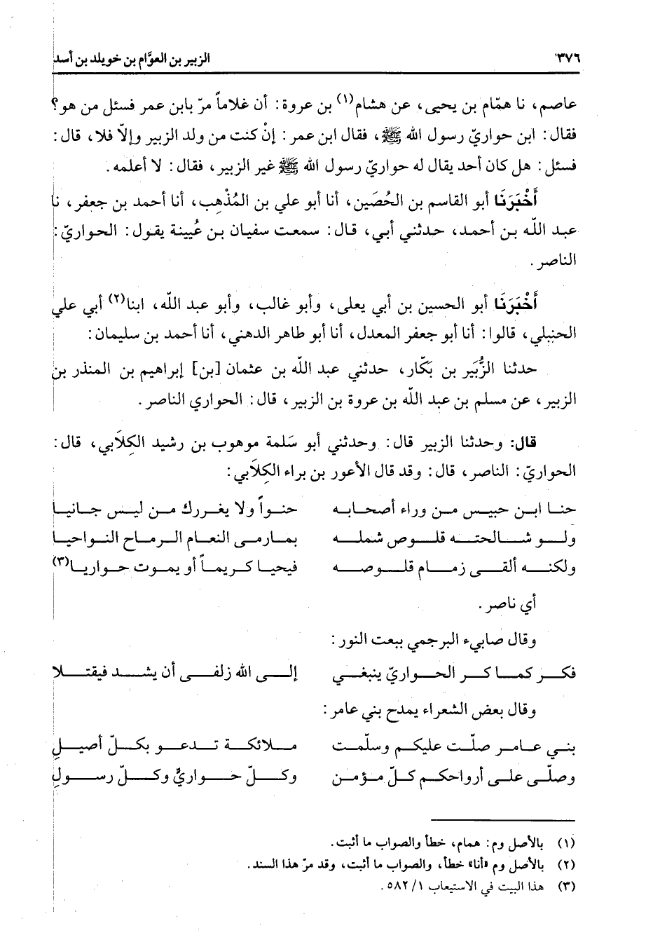 عاصم نا همام بن يحيى عن هشام (1) بن عروة أن غلاما مر بابن عمر فسئل من هو فقال ابن حواري رسول الله (صلى الله عليه وسلم) فقال ابن عمر إن كنت من ولد الزبير وإلا فلا قال فسئل هل كان أحد يقال له حواري رسول الله (صلى الله عليه وسلم) غير الزبير لا أعلمه أخبرنا أبو القاسم بن الحصين أنا أبو علي بن المذهب أنا أحمد بن جعفر نا عبد الله بن أحمد حدثني أبي قال سمعت سفيان بن عيينة يقول الحواري الناصر أخبرنا أبو الحسين بن أبي يعلى وأبو غالب وأبو عبد الله ابنا (2) أبي علي الحنبلي قالوا أنا جعفر المعدل أنا أبو طاهر الدهني أنا أحمد بن سليمان حدثنا الزبير بن بكار حدثني عبد الله بن عثمان بن إبراهيم بن المنذر بن الزبير عن مسلم بن عبد الله بن عروة بن الزبير قال الحواري الناصر قال وحدثنا الزبير قال وحدثني أبو سلمة موهوب بن رشيد الكلابي قال الحواري الناصر قال وقد قال الأعور بن براء الكلابي حنا ابن حبيس من وراء أصحابه * حنوا ولا يغررك من ليس جانيا ولو شالحته قلوص شمله * بمارمى النعام الرماح النواحيا ولكنه ألقى زمام قلوصه * فيحيا كريما أو يموت حواريا (3) * أي ناصر وقال صابئ البرجمي ببعت النور * فكر كما كر الحواري ينبغي * إلى الله زلفى أن يشد فيقتلا * وقال بعض الشعراء يمدح بني عامر بني عامر صلت عليكم وسلمت * ملائكة تدعو بكل أصيل وصلى على أرواحكم كل مؤمن * وكل حواري وكل رسول *