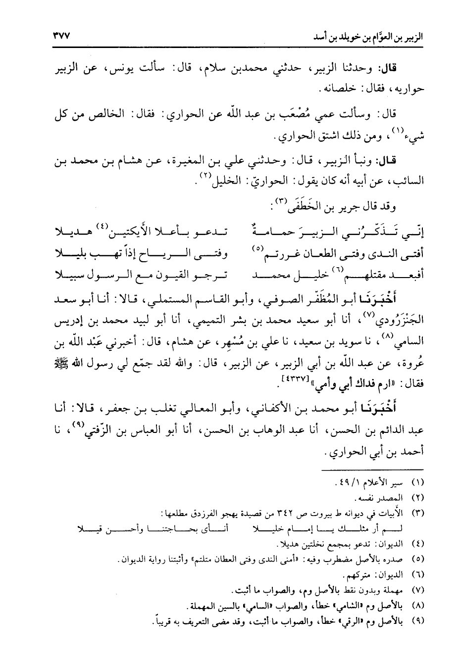 قال وحدثنا الزبير حدثني محمد بن سلام سألت يونس عن الزبير حواريه فقال خلصانه قال وسألت عمي مصعب بن عبد الله عن الحواري فقال الخالص من كل شئ (1) ومن ذلك اشتق الحواري قال ونبأ الزبير قال وحدثني علي بن المغيرة عن هشام بن محمد بن السائب عن أبيه أنه كان يقول الحواري الخليل (2) وقد قال جرير بن الخطفى (3) * إني تذكرني الزبير حمامة * تدعو بأعلا الأيكتين (4) هديلا أفتى الندى وفتى الطعان غررتم (5) * وفتى الرياح إذا تهب بليلا أفبعد مقتلهم (6) خليل محمد * ترجو القيون مع الرسول سبيلا * أخبرنا أبو المظفر الصوفي وأبو القاسم المستملي قالا أنا أبو سعد الجنزرودي (7) أنا أبو سعيد محمد بن بشر التميمي أنا أبو لبيد محمد بن إدريس السامي (8) نا سويد بن سعيد نا علي بن مسهرعن هشام قال أخبرني عبد الله بن عروة عن عبد الله بن أبي الزبير عن الزبير قال والله لقد جمع لي رسول الله (صلى الله عليه وسلم) فقال ارم فذاك أبي وأمي [* * *] أخبرنا أبو محمد بن الأكفاني وأبو المعالي تغلب بن جعفر قالا أنا عبد الدائم بن الحسن أنا عبد الوهاب بن الحسن أنا أبو العباس بن الزفتي (9) نا أحمد بن أبي الحواري