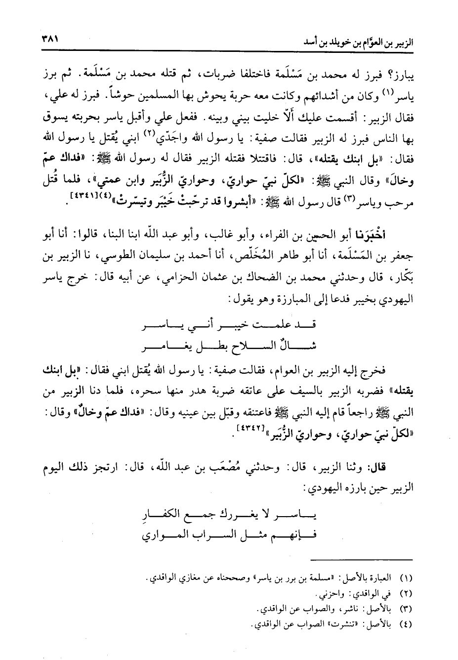 الزبير حين بارزه اليهودي ياسر لا يغررك جمع الكفار * فإنهم مثل السراب المواري