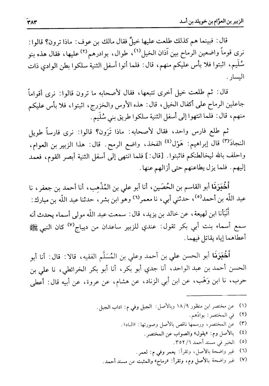 قال فبينما هم كذلك طلعت عليها خيل فقال مالك بن عوف ماذا ترون قالوا نرى قوما واضعين الرماح بين آذان الخيل (1) طوال بوادرهم (2) عليها فقال هذه بنو سليم اثبتوا فلا بأس عليكم منهم قال فلما أتوا أسفل الثنية سلكوا بطن الوادي ذات اليسار قال ثم طلعت خيل أخرى تتبعها فقال لأصحابه ما ترون قالوا نرى أقواما جاعلين الرماح على أكفال الخيل قال هذه الأوس والخزرج اثبتوا فلا بأس عليكم منهم قال فلما انتهوا إلى أسفل الثنية سلكوا طريق بني سليم ثم طلع فارس واحد فقال لأصحابه ماذا ترون قالوا نرى فارسا طويل النجاد (3) قال إبراهيم هول (4) الفخذ واضع الرمح قال هذا الزبير بن العوام واحلف بالله ليخالطنكم فاثبتوا قال فلما انتهى إلى أسفل الثنية أبصر القوم فعمد إليهم فلما يزل يطاعنهم حتى أزالهم عنها أخبرنا أبو القاسم بن الحصين أنا أبو علي بن المذهب أنا أحمد بن جعفر نا عبد الله بن أحمد (5) حدثني أبي نا معمر (6) وهو ابن بشر حدثنا عبد الله بن مبارك أنبأنا ابن لهيعة عن خالد بن يزيد قال سمعت عبد الله مولى أسماء يحدث أنه سمع أسماء بنت أبي بكر تقول عندي للزبير ساعدان من ديباج (7) كان النبي (صلى الله عليه وسلم) أعطاهما إياه يقاتل فيهما أخبرنا أبو الحسن علي بن أحمد وعلي بن المسلم الفقيه قالا قال أنا أبو الحسن أحمد بن عبد الواحد أنا جدي أبو بكر أنا أبو بكر الخرائطي نا علي بن حرب نا ابن وهب عن ابن أبي الزناد عن هشام عن عروة عن أبيه قال أعطى